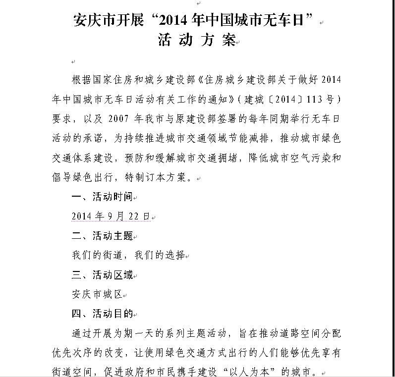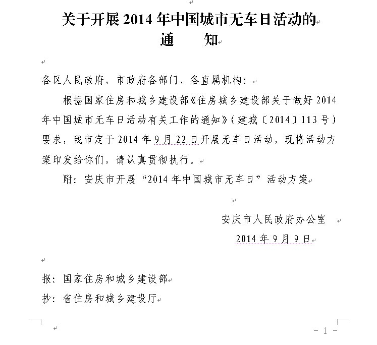 转发安庆市人民政府《关于开展2014年中国城市无车日活动的通知》的文件