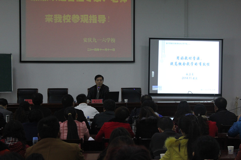 11月12日上午,我校校长周诗长向与会代表致辞,介绍安庆九一六学校相关概况。随后,全省120余名生物教师和我校老师有幸聆听了人教社副主编、高初中教材、高初中《生物课程标准》编写核心组成员赵占良老师的《利用教材资源,提高概念教学的有效性》的报告。赵老师的报告深入浅出、通俗易懂,让在座的老师受益匪浅。