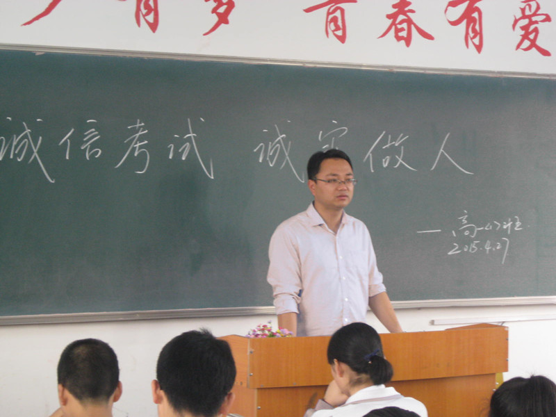 为加强高一年级组的考风考纪,使全体学生树立正确的考试观念,为将到来的期中考试打下良好的诚信氛围,高一年级组各班在4月27日召开了“诚信考试”主题班会。班主任带领全班同学学习我校学生考试纪律,并给与解释,要求学生考出自己的水平,诚信考试、诚信做人。