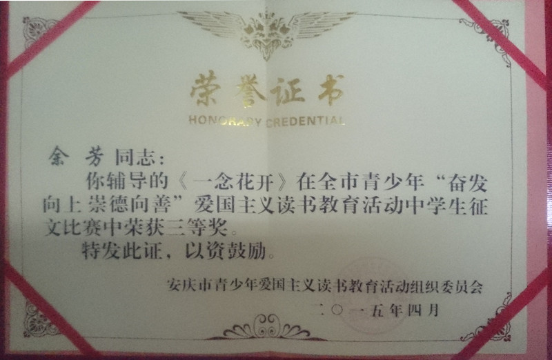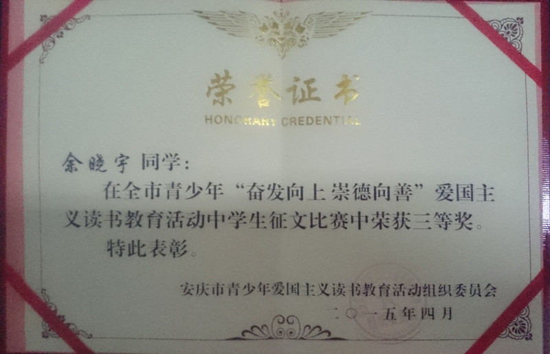 在刚刚结束的安庆市青少年“奋发向上,崇德向善”爱国主义读书活动的征文比赛中,我校高一8班余晓宇同学荣获安庆市三等奖,同时,我校余芳老师获得优秀指导教师奖。本次比赛全市近300篇征文仅80篇获奖。在此,对他们取得的成绩表示祝贺。