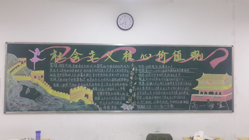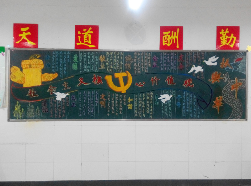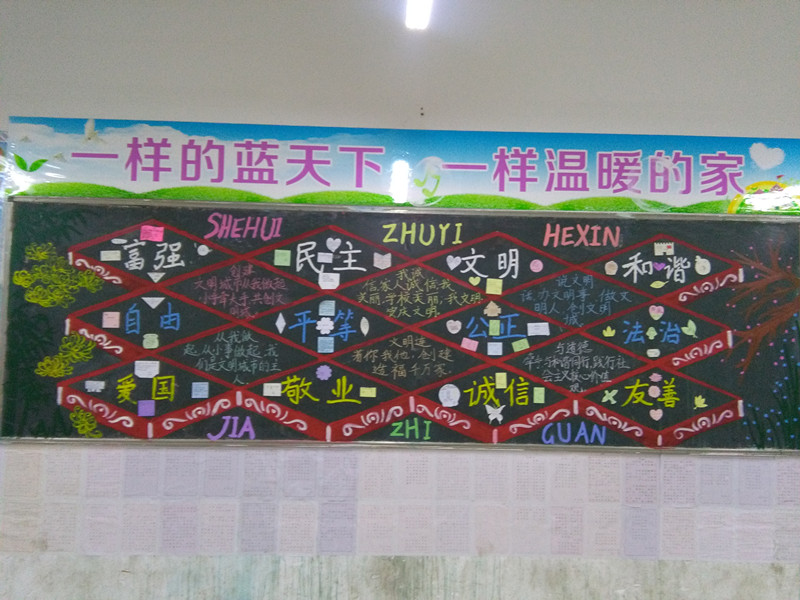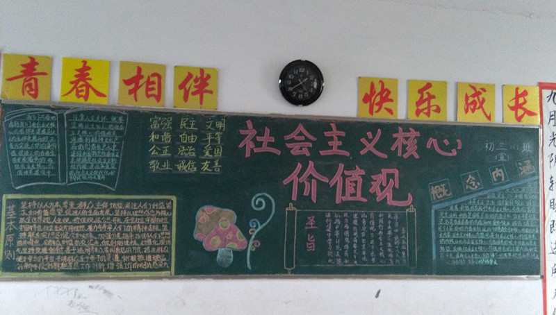 为了让师生进一步理解社会主义核心价值观的内涵,把握其精神实质,同时也为创建文明城市增加浓厚氛围,丰富校园文化建设内容,我校举行一次以弘扬社会主义核心价值观为内容的黑板报评比活动。