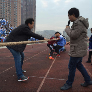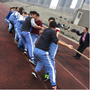 此次比赛每班抽取男生9人、女生6人参加,比赛实行淘汰制晋级方式,抽签分组决定比赛顺序。当比赛的哨声一响起,队员们口中一起高呼着“一二,一二”, 双手紧握长绳,憋足了劲拼命往后拉,班主任也在队伍旁边助阵加油,恨不得抓起绳子跟学生一起努力!同学们自发组成啦啦队为本班人员加油。号子声、呐喊声,此起彼伏,飘荡在整个校园的上空。