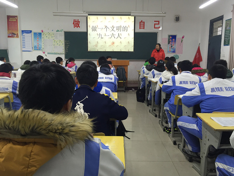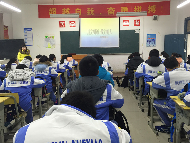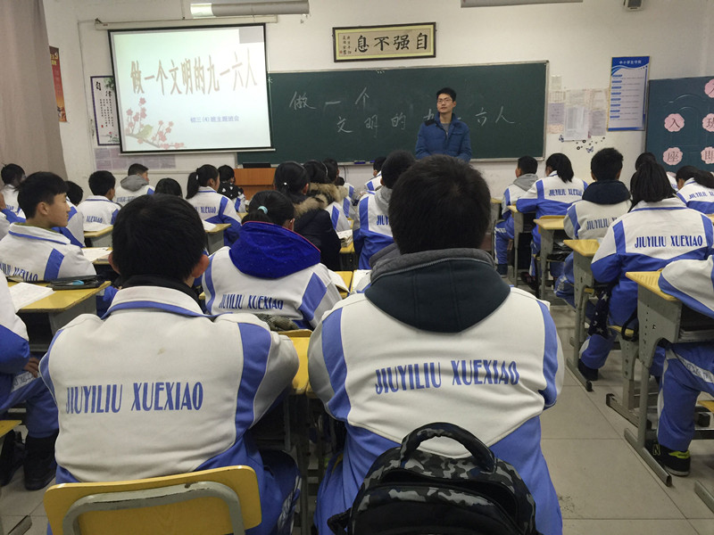 元月18日,初三年级开展了一次“做一个文明的九一六人”的主题班会。班会上,班主任们从“文明”二字入手,在“对自己、对他人、对集体、对社会”四个方面对学生进行教育。学生们积极讨论,明确如何做一个文明的九一六人,并就自身不文明的现象进行了自省。