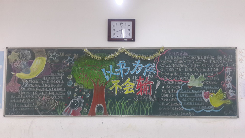 通过此次主题黑板报评比活动,让全校学生在浓浓的读书氛围中,展现个性风采和精神面貌,提高审美情趣和文化底蕴,做个快乐读书人,营造真正的“书香校园”氛围。