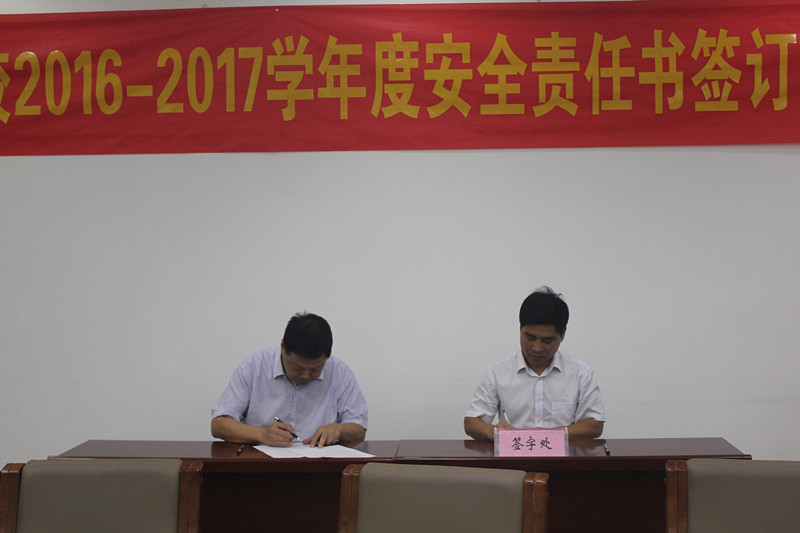 为加强学校各部门安全意识,将打造“平安校园”的工作落实到实处,依据学校工作安排,我校于9月20日晚举行了2016—2017学年度安全工作责任书签订仪式,仪式由执行校长侯纪明主持,全体行政干部出席了本次仪式。