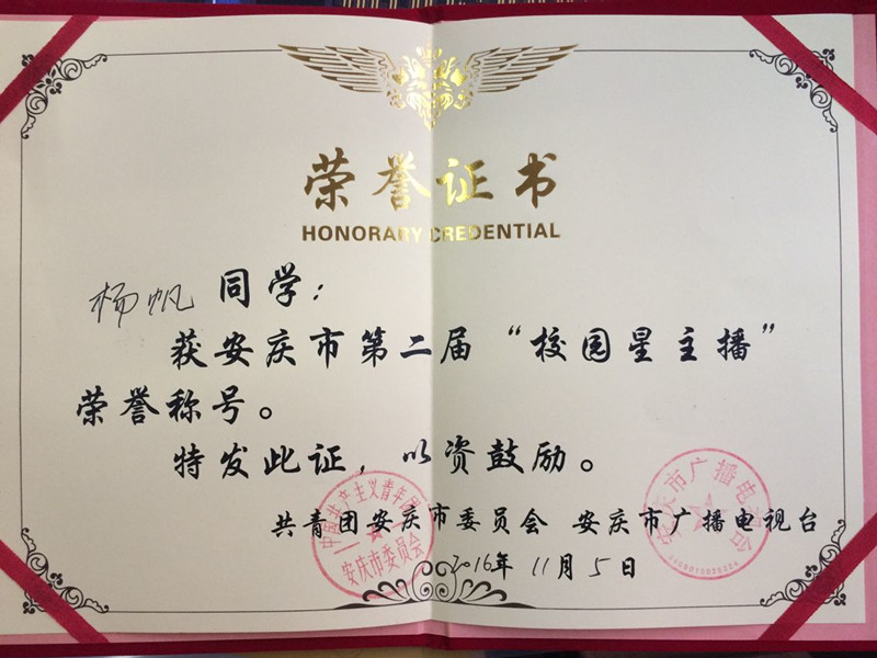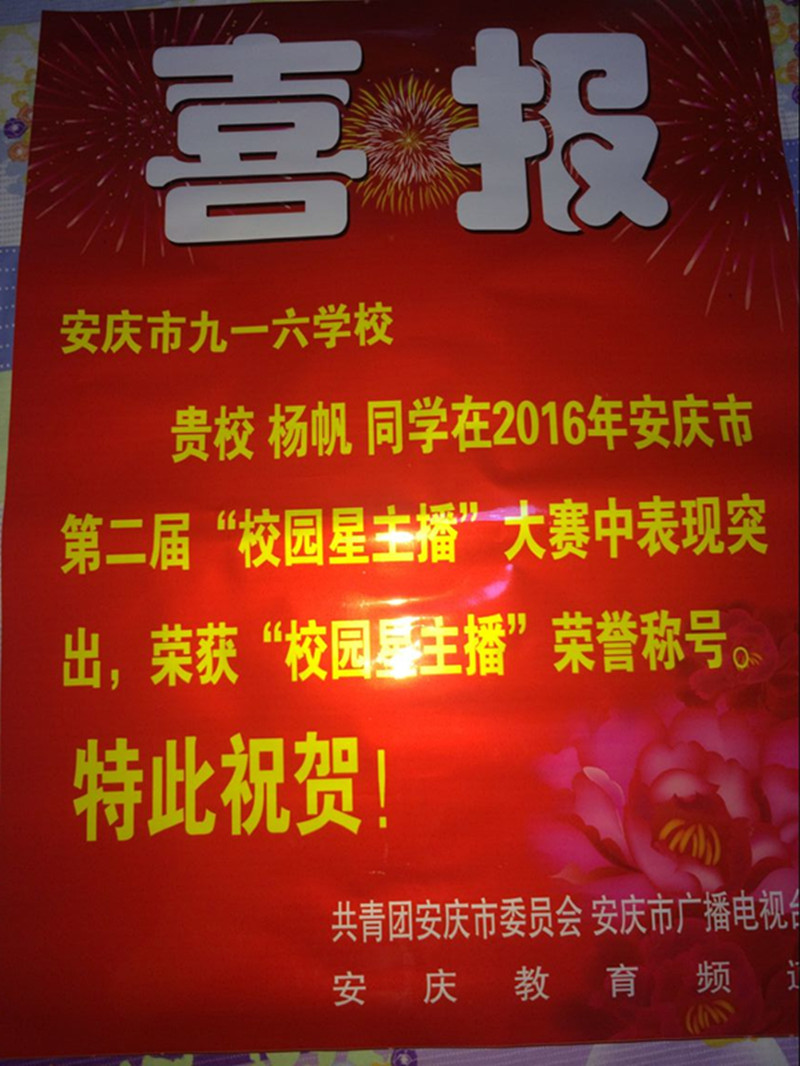 近日,由共青团安庆市委员会、安庆市广播电视台主办,安庆教育频道承办的2016年安庆市第二届“校园星主播”大赛落下了帷幕。我校高二(11)班杨帆同学,经过初赛、复赛层层筛选进入决赛。在决赛中,杨帆同学语言流利、台风稳重,落落大方,在这场比赛中脱颖而出,获得本次比赛高年龄组的第一名,并荣获“校园星主播”称号。在此,向获奖的同学表示祝贺,向指导老师表示感谢!