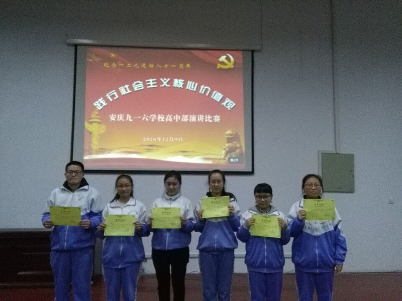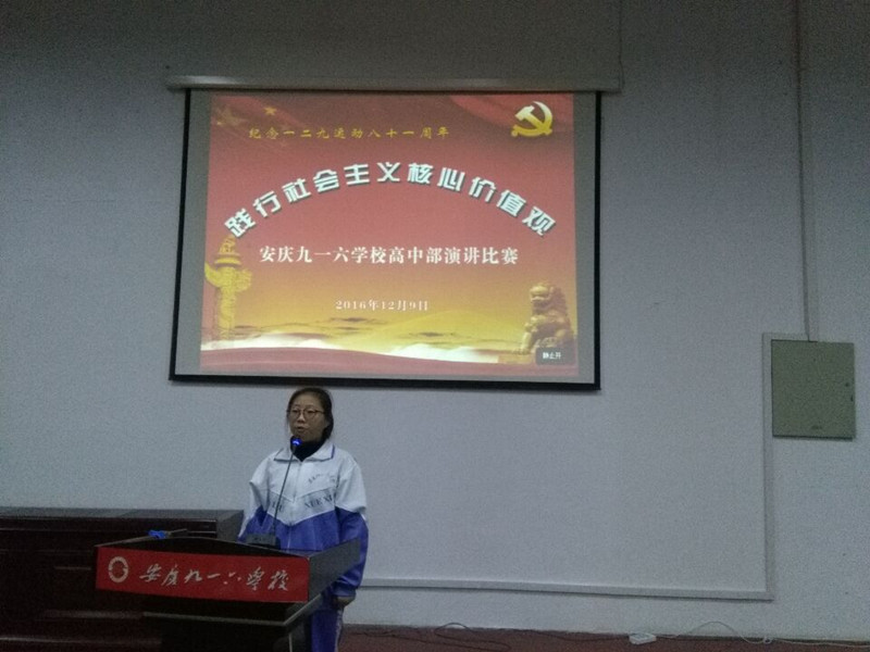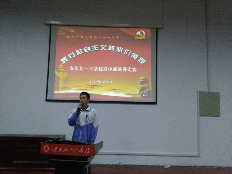 为纪念“一二·九运动”81周年,积极参与文明城市创建工作, 引导学生培育和践行社会主义核心价值观, 提高学生思想道德素质,丰富校园文化生活内涵。12月9日晚,我校高中部在行政楼二楼阶梯教室举办“践行社会主义核心价值观”主题演讲比赛。