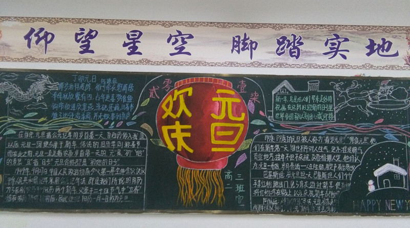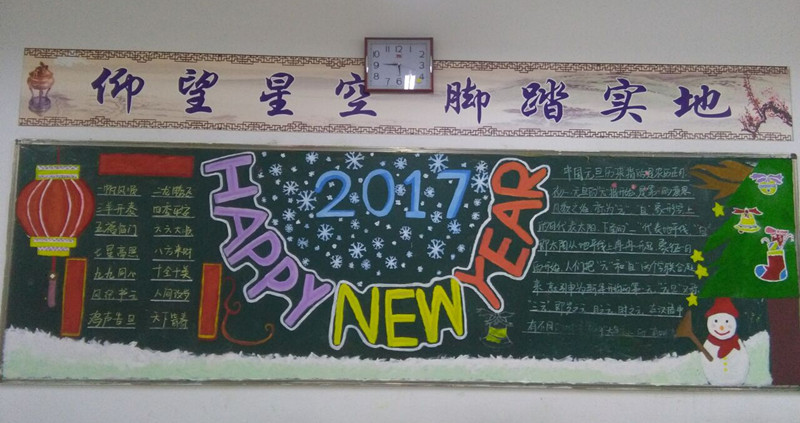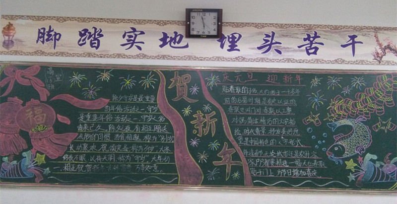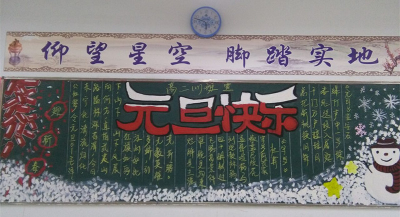 各班在班主任和学生的策划下,各班的黑板报主题鲜明,内容有吸引力,美观大方,色彩鲜明,搭配和谐自然,版面设计新颖独特、有风格,体现个性化和创意。同学们的祝福,新年的愿望,元旦的来历等等,都在这小小的方寸之间绽放光彩,吸引了众多同学和老师的目光,为我校校园文化增添了一道靓丽的风景线。