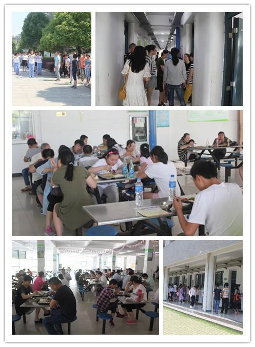 食堂中,家长和师生共进午餐,宽阔的就餐环境,周到热情的服务、色味俱佳的菜肴、丰富多样的菜品,让家长朋友们赞不绝口。