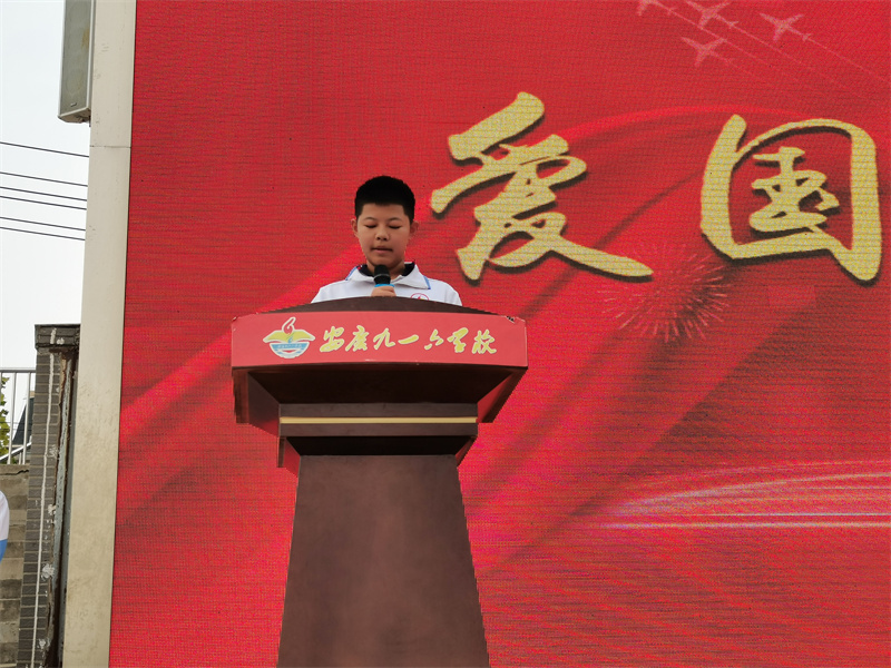 同学们,只要你付出不懈的努力,明天的你,一定会是个出色的你,你的父母会为有你这样优秀的儿女而骄傲!九一六学校为有你这样优秀的学生而自豪!同学们:让我们在五星红旗下庄严宣誓:读书做人,从我做起,从现在做起,为自己、为父母、为祖国添光加彩吧!最后,让我们共同祝愿我们伟大祖国永远繁荣昌盛!让我们的五星红旗在每一个中国人心中永远飘扬!