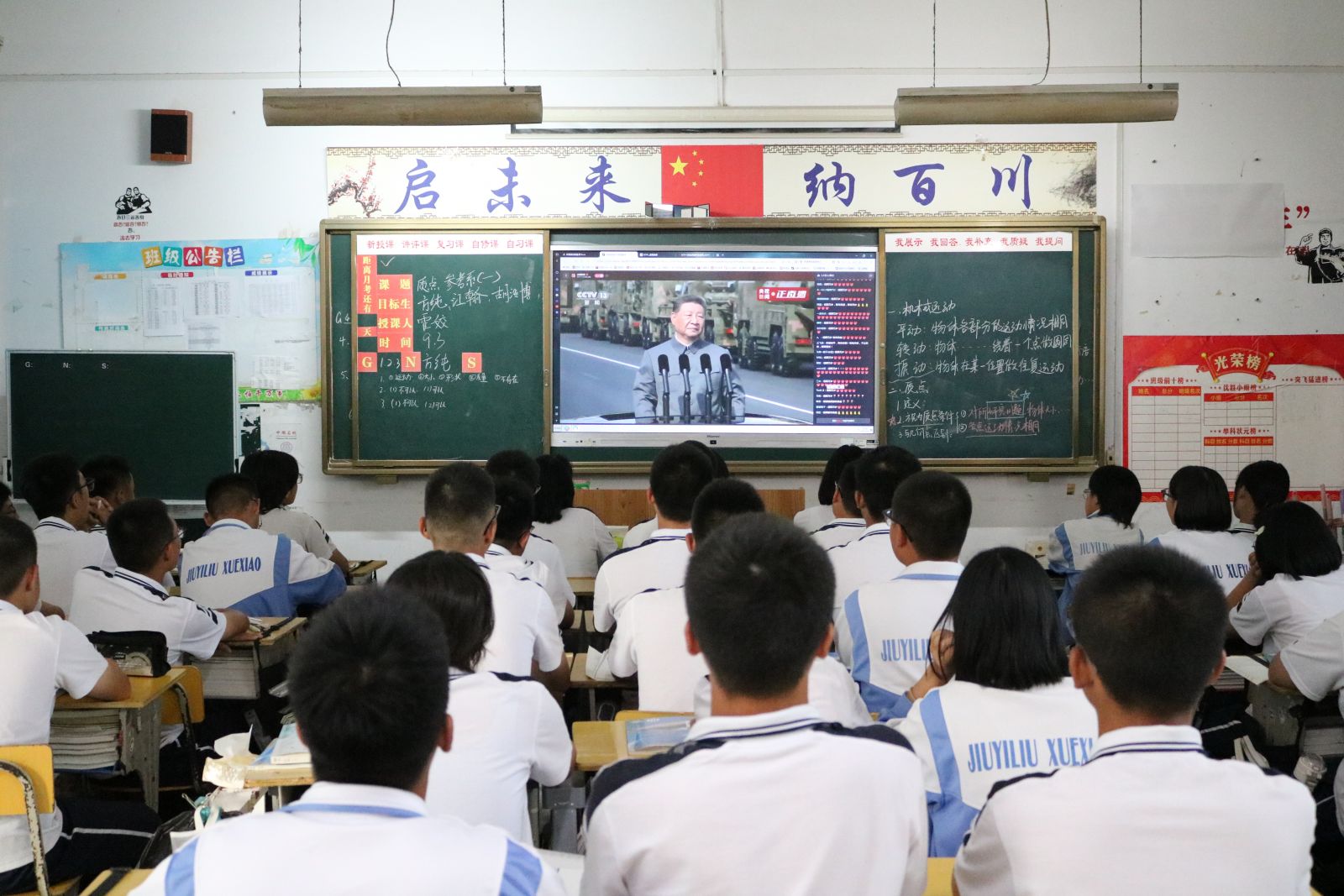 观看过程中,师生们情绪高昂、精神振奋。当军容严整、意气风发的受阅官兵庄严行进通过天安门广场时,现场多次响起热烈掌声。