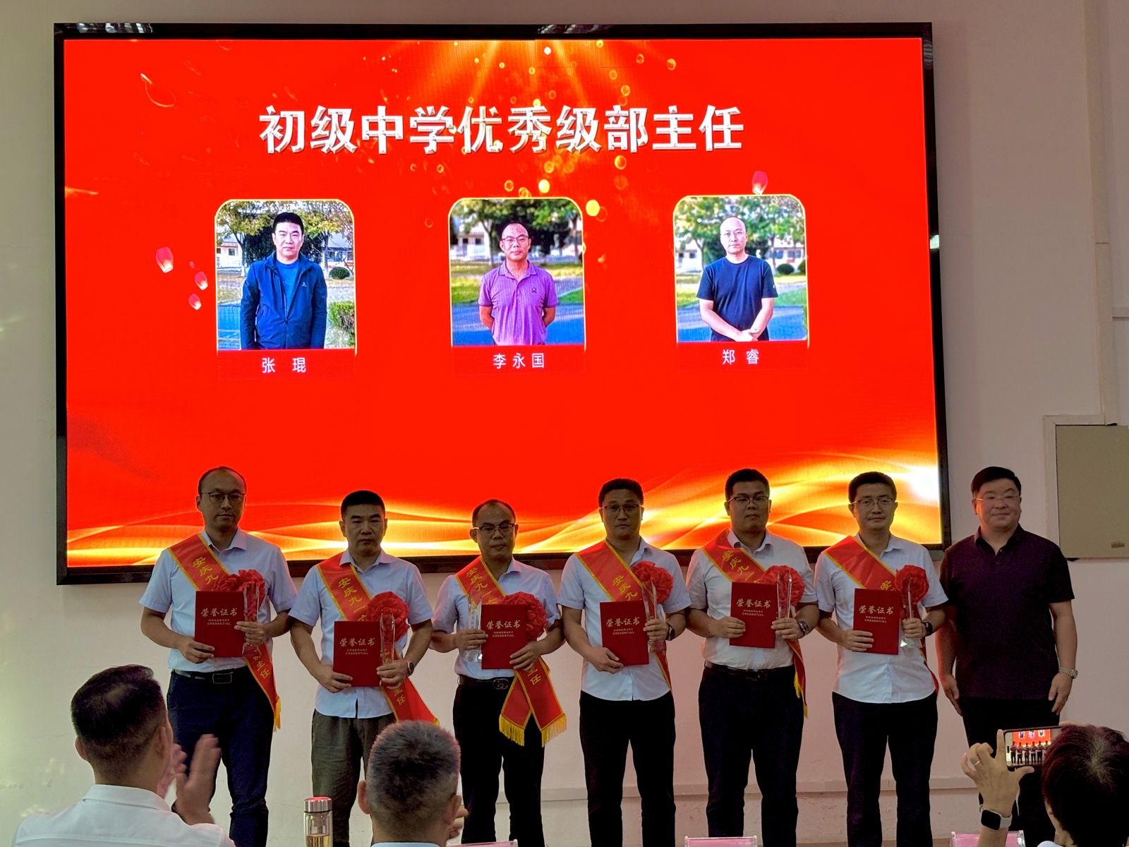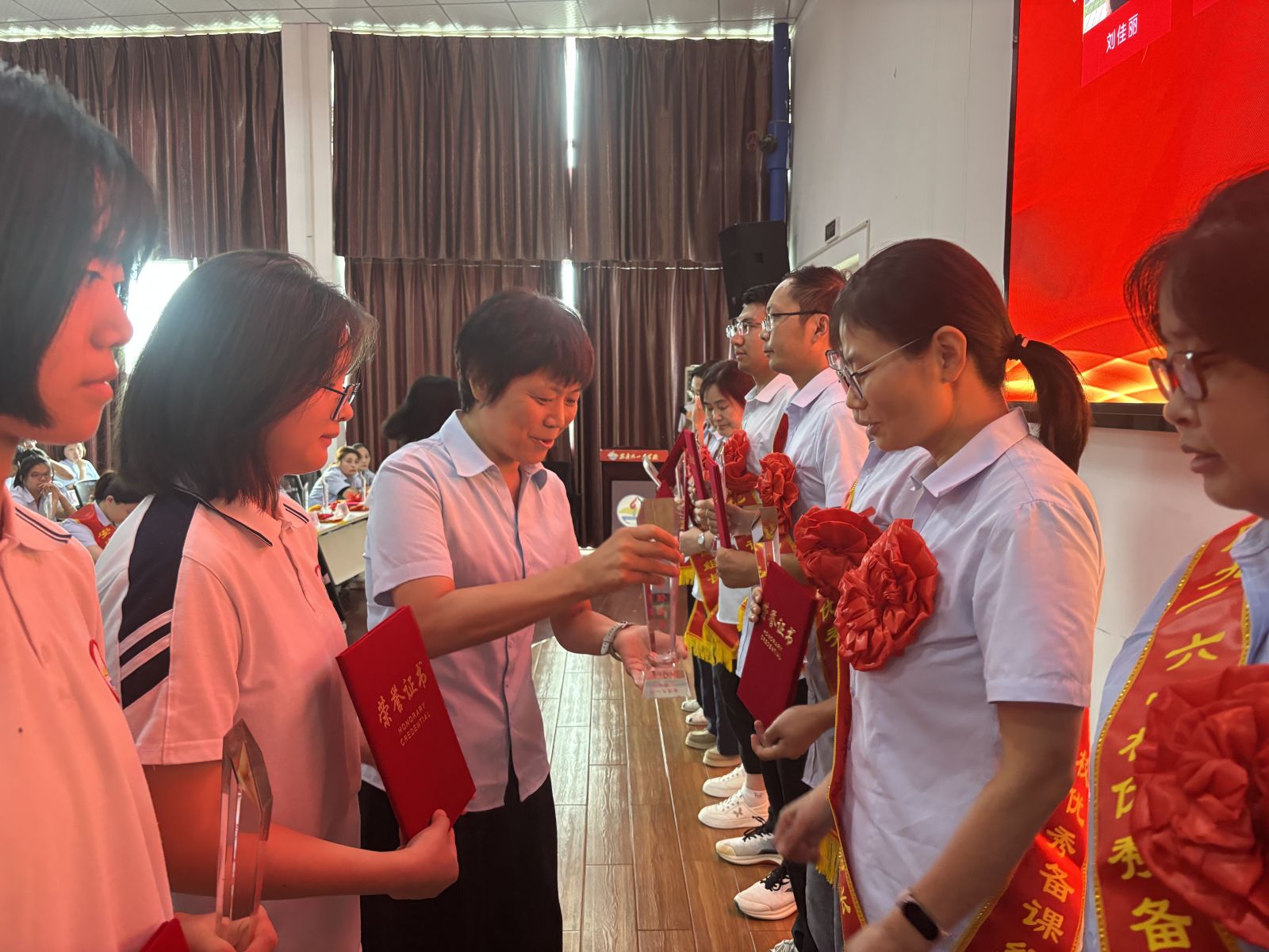 在热烈的掌声中,大会进入了隆重的表彰环节。学校领导先后宣读了“关于表彰2024-2025学年度优秀教师、优秀班主任、优秀备课组长、优秀员工和优秀级部主任的决定”。表彰环节,获奖教职工们依次上台领奖,校领导为他们颁发奖杯及证书并合影留念。