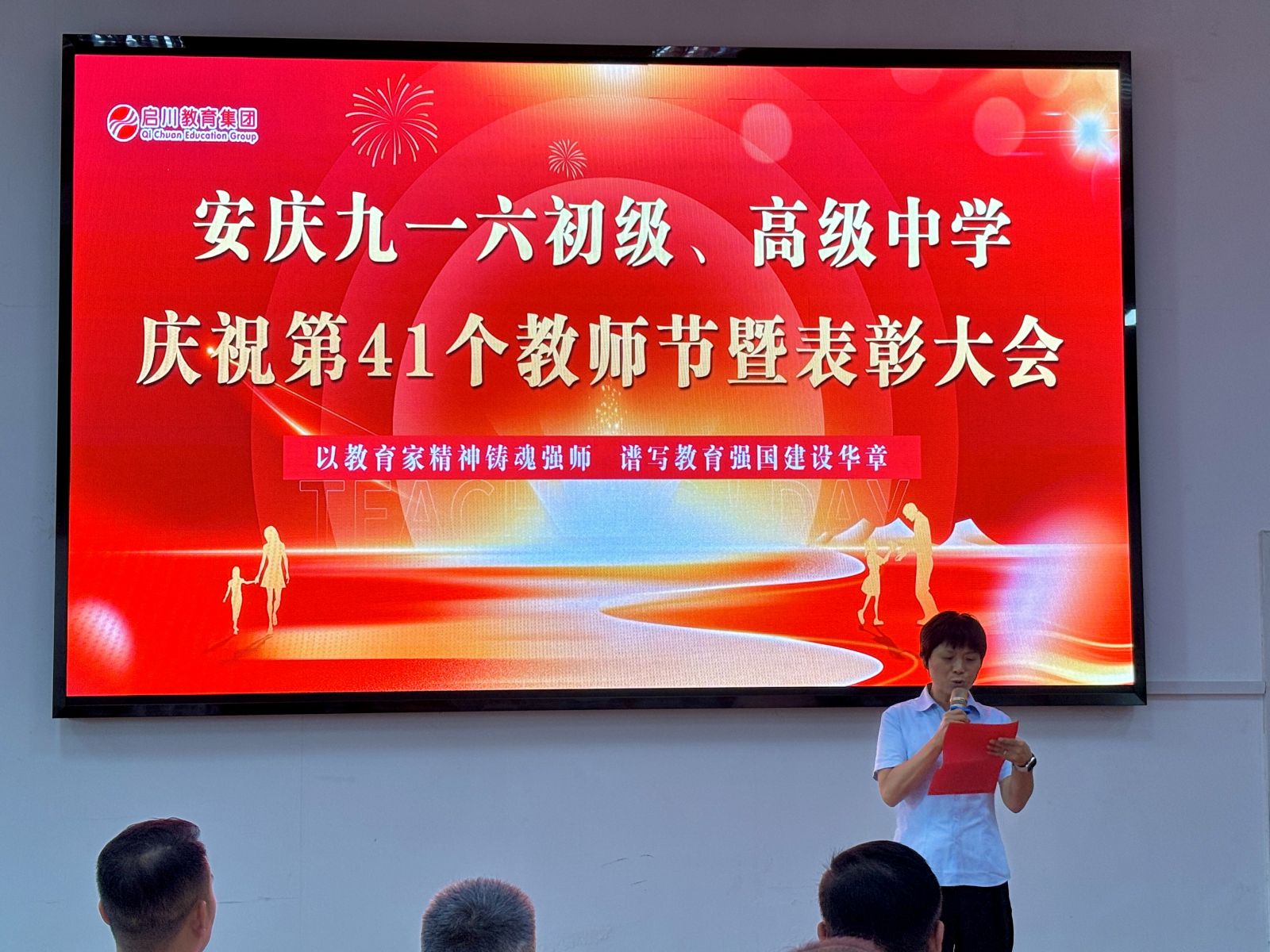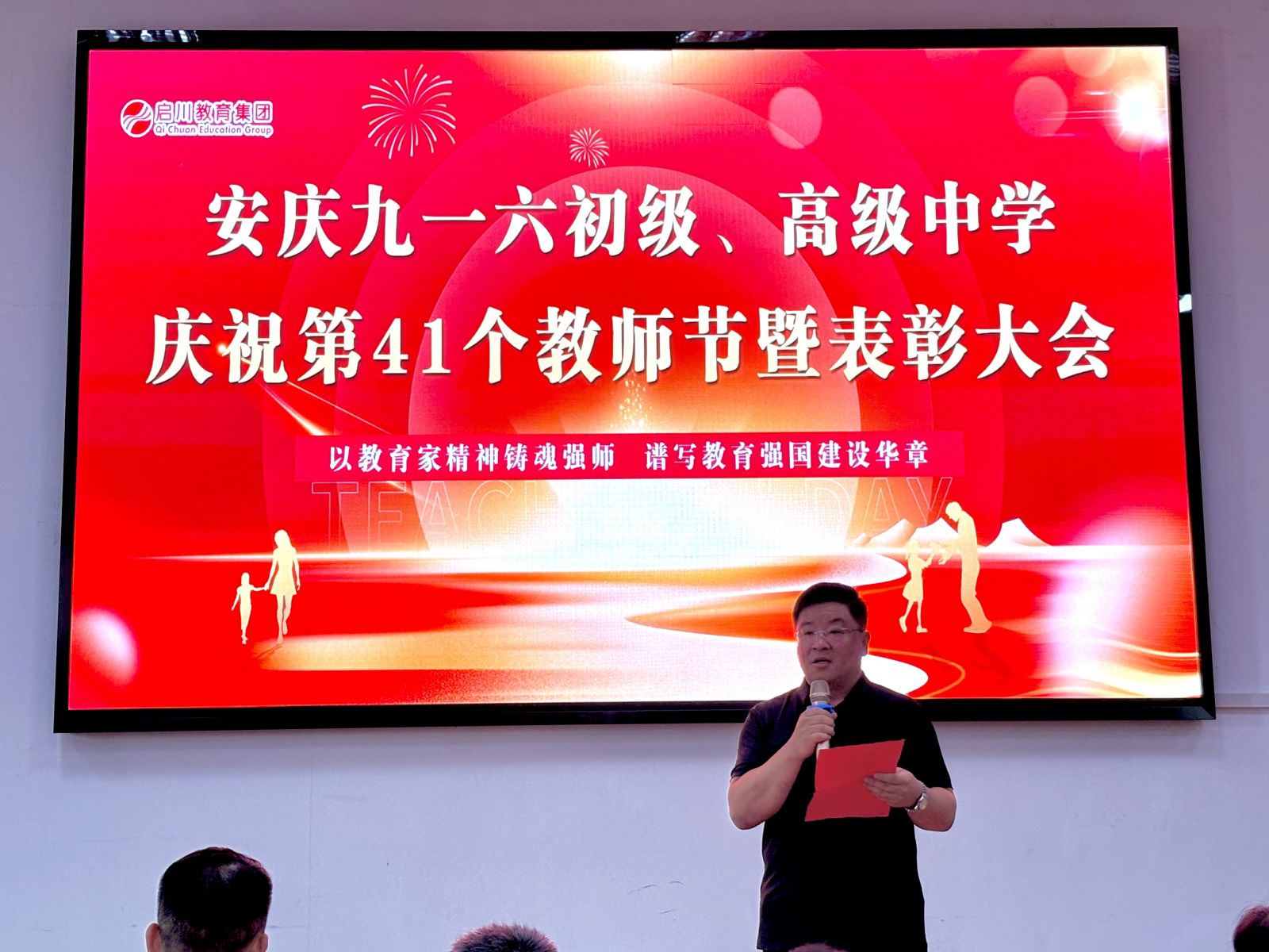 随后,齐校长传达了董事长程启川先生致全体教职工的节日贺词。贺词中弘扬“教育家精神”,这是多次被提及的概念,它并非遥不可及,而是体现在日常教学的点点滴滴中。这是一份融合了敬意、期望、承诺与战略的综合性发言,董事长既是对教师过去辛勤付出的肯定,更是对未来教育方向的引领。总而言之,期望教师们在未来能成为心怀家国、德才兼备、拥抱创新、关爱学生的教育工作者,在变革的时代中坚守育人初心,携手共赴教育的新征程。