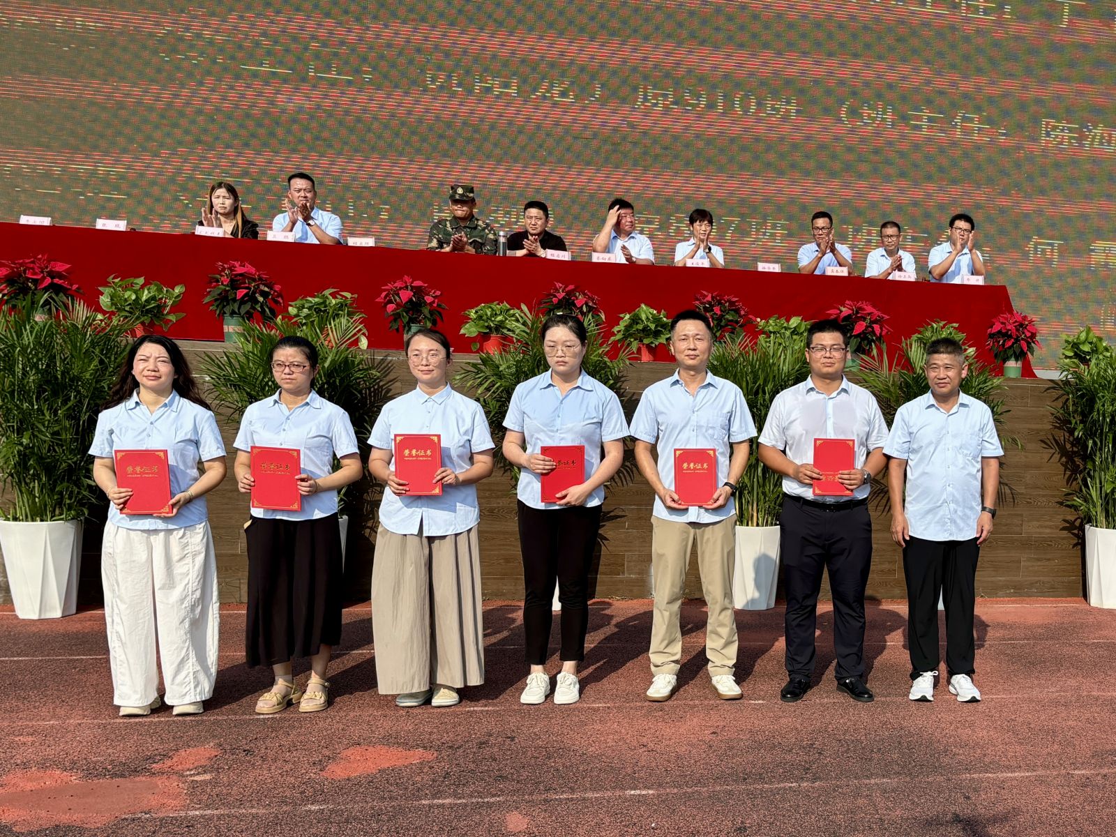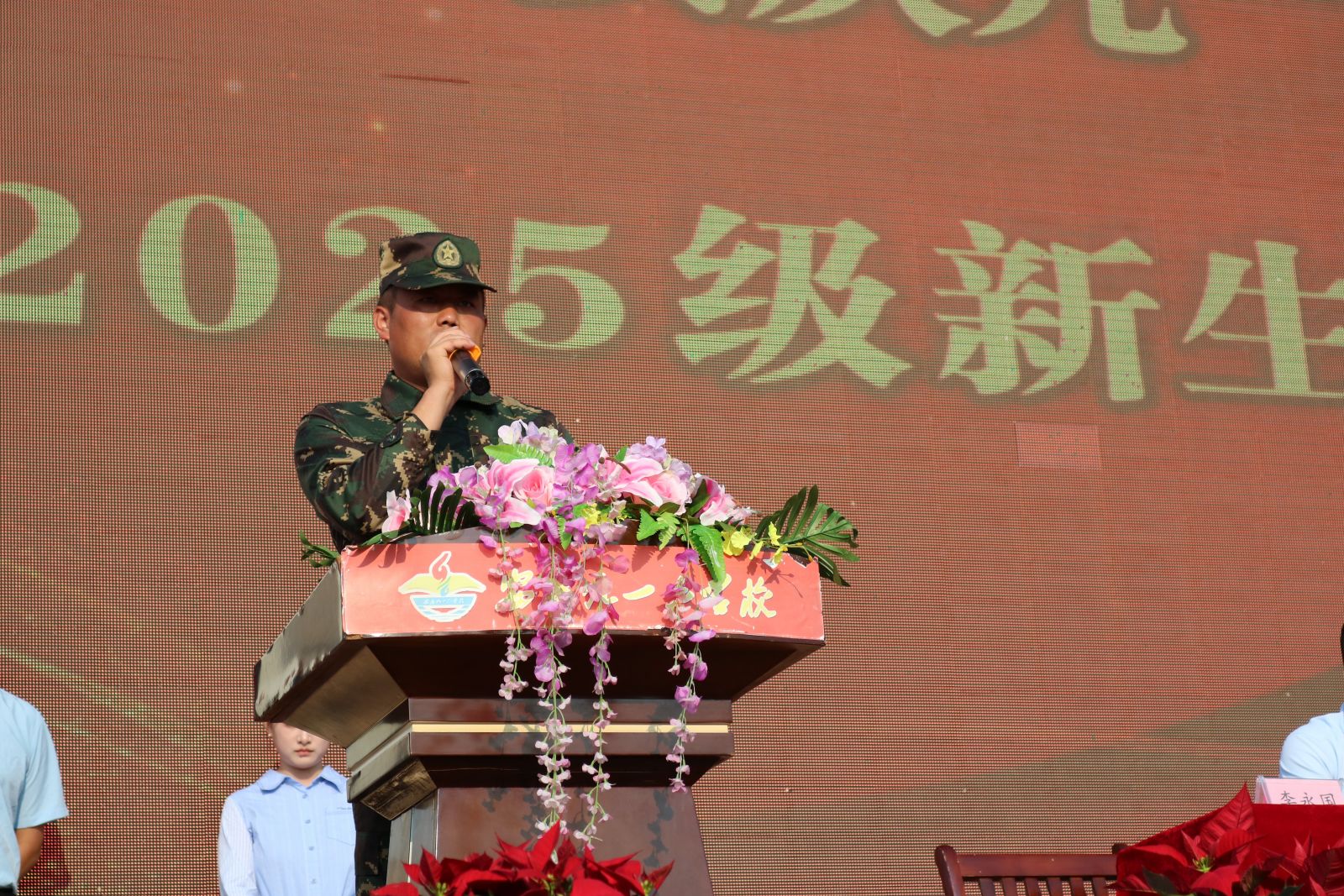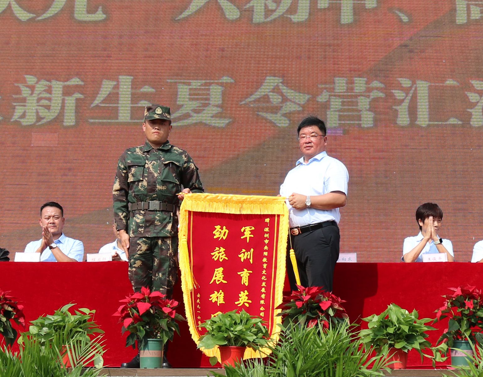 大屏幕上播放着教导员和同学们的合影。回望这段时光,教官们以钢铁般的意志和温暖的心灵,陪伴我们度过了每一个汗水与欢乐交织的瞬间,见证着我们的成长与蜕变。他们用汗水浇灌我们的坚韧,用智慧点亮我们的前行之路。虽然离别在即,但同学们会铭记教官的教诲,勇敢向前,在人生的战场上创造属于自己的辉煌。