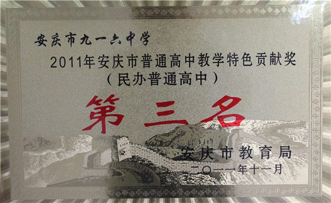 根据安庆市教育局公布的2011年全市高考数据分析,我校继2010年首届高考便荣获安庆市普通高中教学质量优秀奖民办高中第一名之后,2011届高考总均分系数(即教学质量优秀奖)蝉联全市所有民办高中第一名!同时,我校因高考成绩突出,荣获2011年安庆市普通高中教学特色贡献奖!