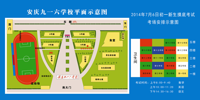 我校7月6日举行初一新生摸底考试。请家长在考试期间做好接送工作 ,考试时间及考场安排如下:(注:8月下旬由市教研室组织的学情调研检测照常进行,具体时间及安排见我校网站 )