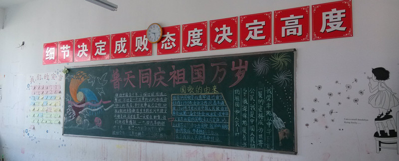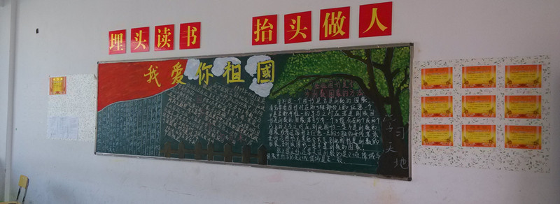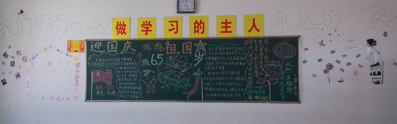 为庆祝建国65周年,激发学生的爱国热情,美化班级文化环境,高一年级开展“庆国庆”黑板报评比的活动。每个班都精心设计自己班的黑板报,每块黑板报上都充满了同学们的爱国之情。