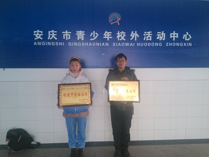 12月5日,我校陆奕尧,荣谢天同学分别代表“九一六人”文学社和九一六模联社参加了由市教育局举办的安庆市第四届中学生社团文化艺术节活动,此次活动中我校文学社荣获安庆市“明星社团”称号,模联社荣获安庆市“优秀社团”称号,并且陆奕尧同学还荣获教育局颁发的“学生先进个人”奖,在此对获奖社团和个人表示热烈祝贺。