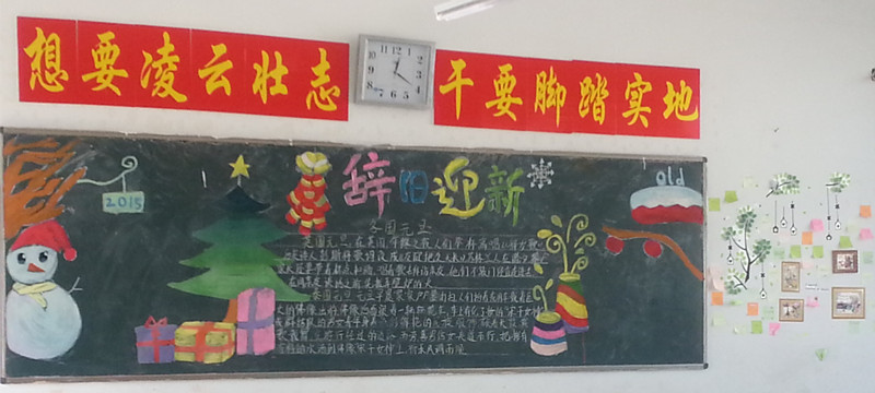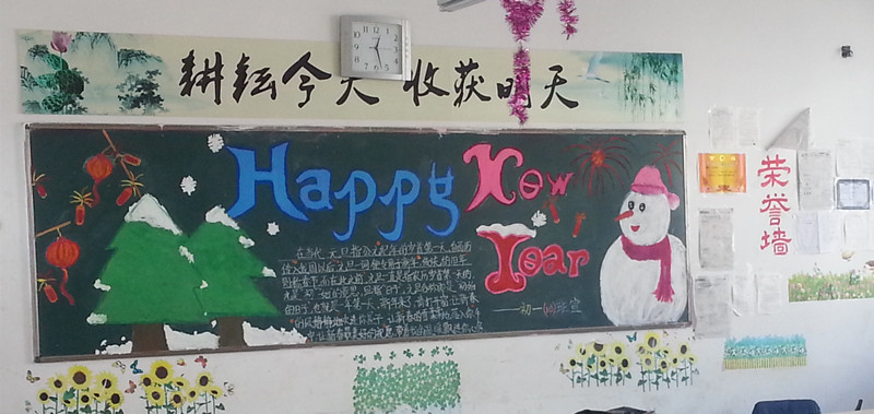 2015年的脚步已经近了,为了让我们的教室在这新的一年有崭新的面貌,初一年级展开“迎新春”板报评比。各个班级充分发挥学生的主观能动性,从板报设计和制定都有学生决定,板报色彩鲜艳,主题积极向上,让我们的学生在新的一年来临之际有一种焕然一新的感觉。