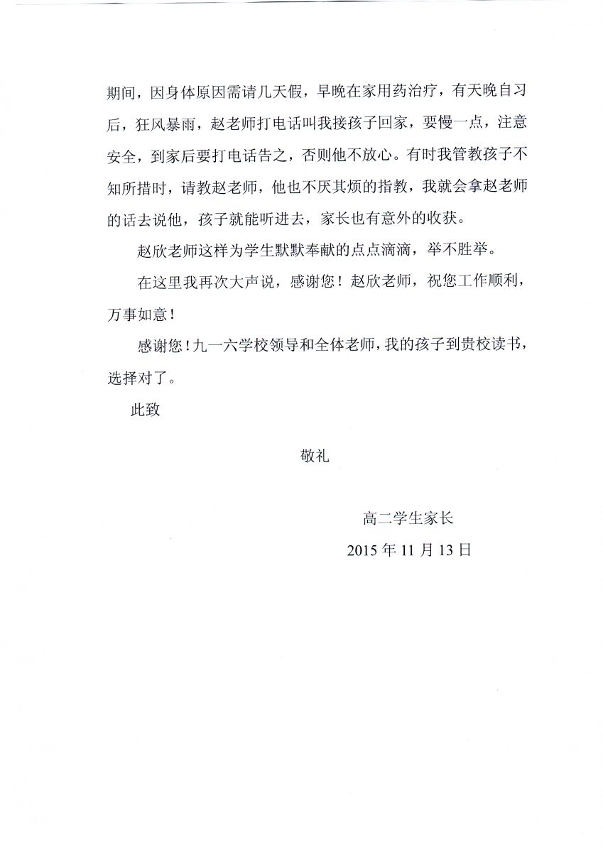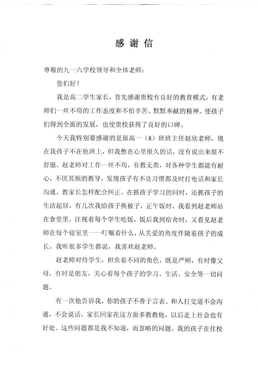 高二学生家长致我校领导和全体教师的感谢信