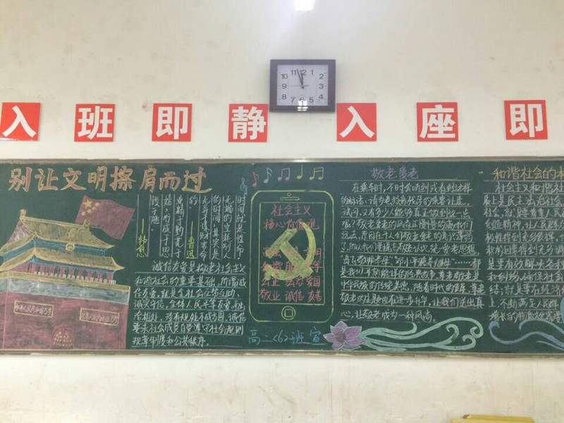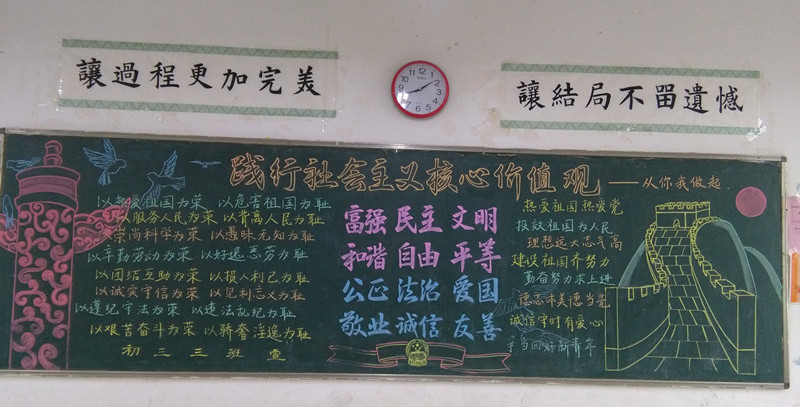 为了让师生进一步理解社会主义核心价值观的内涵,把握其精神实质,同时也为创建文明城市增加浓厚氛围,丰富校园文化建设内容,我校举行一次以弘扬社会主义核心价值观为内容的黑板报评比活动。