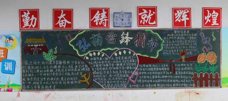 为深入开展学雷锋活动,大力弘扬雷锋精神,积极践行社会主义核心价值观,不断提升学生思想道德素质,促进学校内涵式发展,我校积极开展以“弘扬雷锋精神,构建和谐校园”为主题的黑板报评比活动。