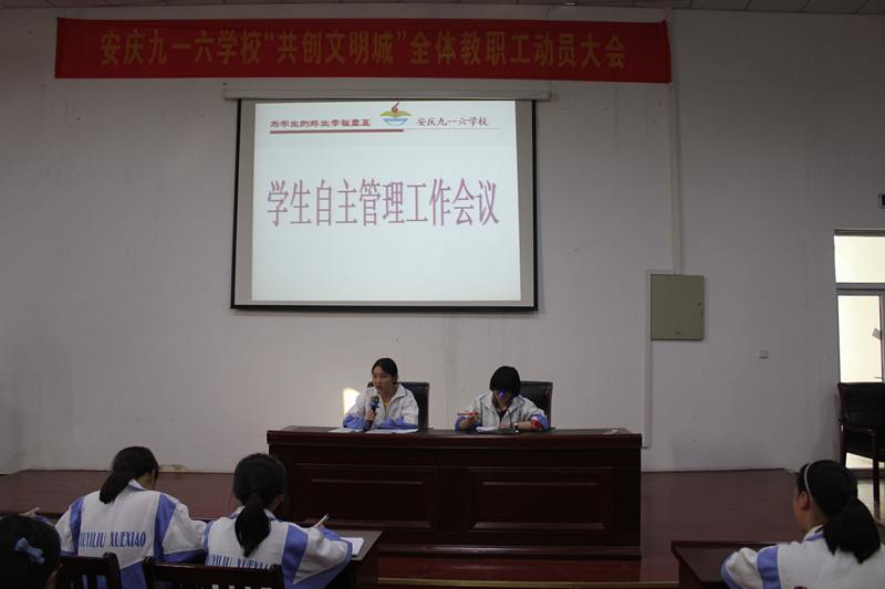 本次会议由校学生会秘书长汪雨晨同学主持,首先她总结了前段时间学生自主管理的情况,接着她针对毕业年级马上面临中高考的特殊性,微调了自主管理的具体工作安排、强调管理中注意事项,最后她指出了在食堂、在出入门时具体问题,要求所有管理干部以身作为,认真做好各项自主管理工作。校学生会主席韩静同学做了总结发言,她对所有管理干部提出了十点要求,希望大家明确自己的职责,摆正工作态度,发扬积极肯干的精神,进一步提高工作质量,为打造一个更温馨、更和谐的九一六大家庭而努力!