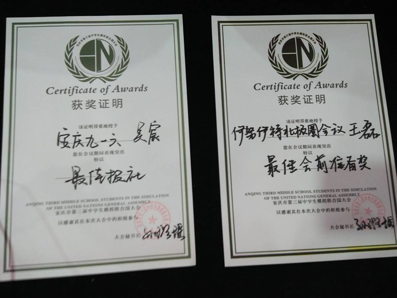 4月30日—5月2日,2016年安庆市第三届中学生模拟联合国大会在宿松县安瑞大酒店举行。本次大会由安庆市教体局、共青团安庆市委员会主办,市程集中学承办的一次面向高中学生的模拟联合国会议。我校模联社共有八名同学积极参会,获得两项大奖。