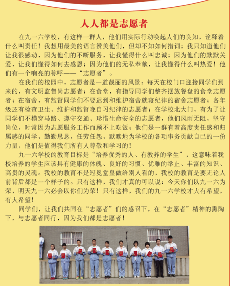 近日,在各年级组推荐人选、学部审核材料、校评选小组审定的基础上,共评选出十名优秀志愿者。5月23日,利用周一晨会期间,举行了隆重的“校园十佳志愿者”表彰活动。政教处吴聪主任发表了《人人都是志愿者》的演讲,他对校园志愿者的无私奉献予以了肯定,对志愿者服务的意义和作用做了详细阐述,号召更多的学生加入到志愿者服务队伍,锻炼自己,服务他人,九一六人人都是志愿者。