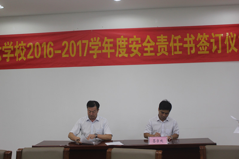为加强学校各部门安全意识,将打造“平安校园”的工作落实到实处,依据学校工作安排,我校于9月20日晚举行了2016—2017学年度安全工作责任书签订仪式,仪式由执行校长侯纪明主持,全体行政干部出席了本次仪式。