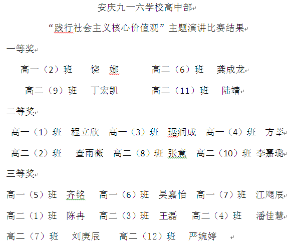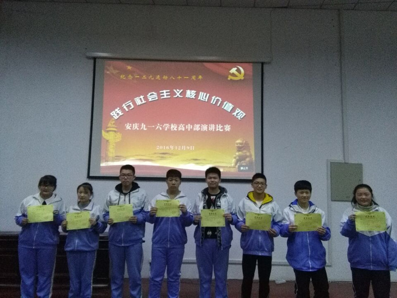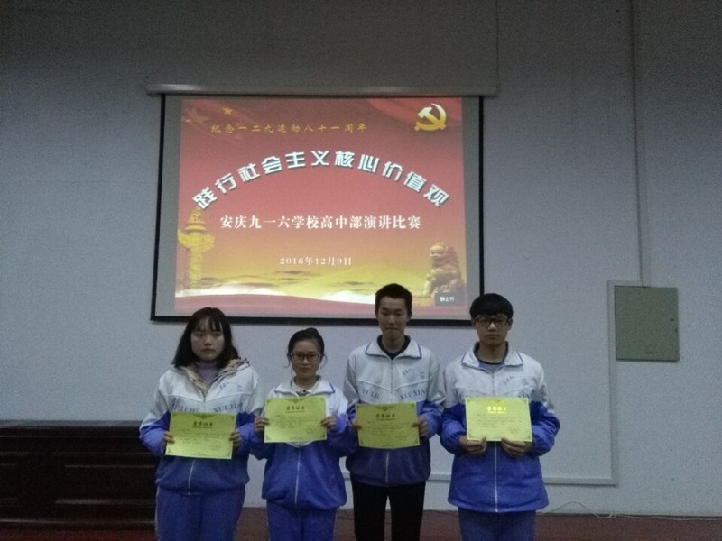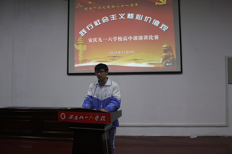 为纪念“一二·九运动”81周年,积极参与文明城市创建工作, 引导学生培育和践行社会主义核心价值观, 提高学生思想道德素质,丰富校园文化生活内涵。12月9日晚,我校高中部在行政楼二楼阶梯教室举办“践行社会主义核心价值观”主题演讲比赛。