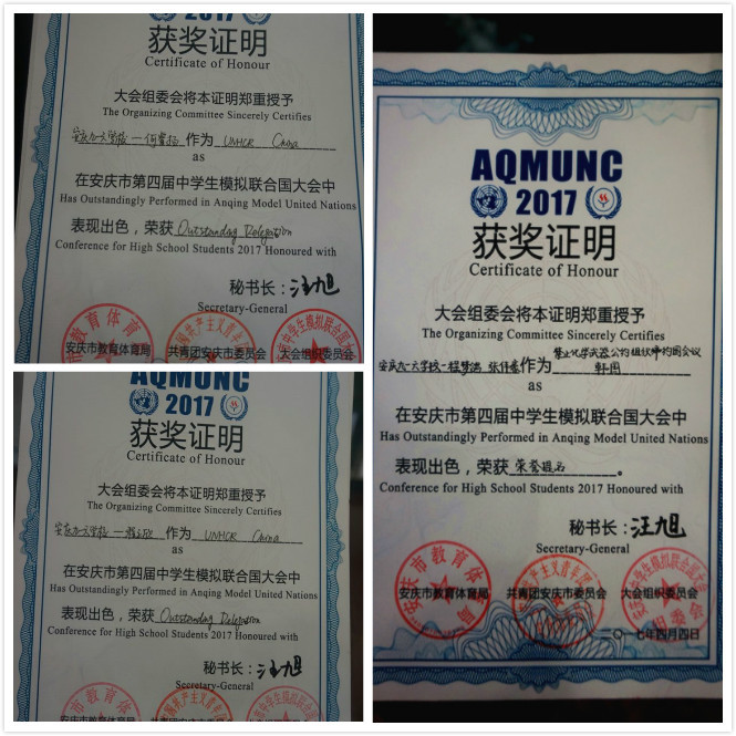 会前,我校模联社开展了多次校内培训会,进行了精心会议准备工作。其中,我校模联社社长、高二(3)班王磊同学担任禁止化学武器公约组织缔约国会议主席团职务。会上,我校代表们与来自全市各个学校的模联精英们相互交流,同时充分发挥自己的能力,展现九一六学生的精神风貌。他们出色的外交风采和对问题的深入理解,赢得了主席团与在场代表的高度赞扬,为我校赢得了荣誉。其中,在禁止化学武器公约组织缔约国会议会场,高一(1)班程梦鸽和张伟豪获得“荣誉提名奖”;在UNHCR会场,高一(1)班程立欣和初二(1)班何睿扬获得“杰出代表奖”;同时主席团对高一(1)班金政平和唐文玲两位代表提出了口头表扬。