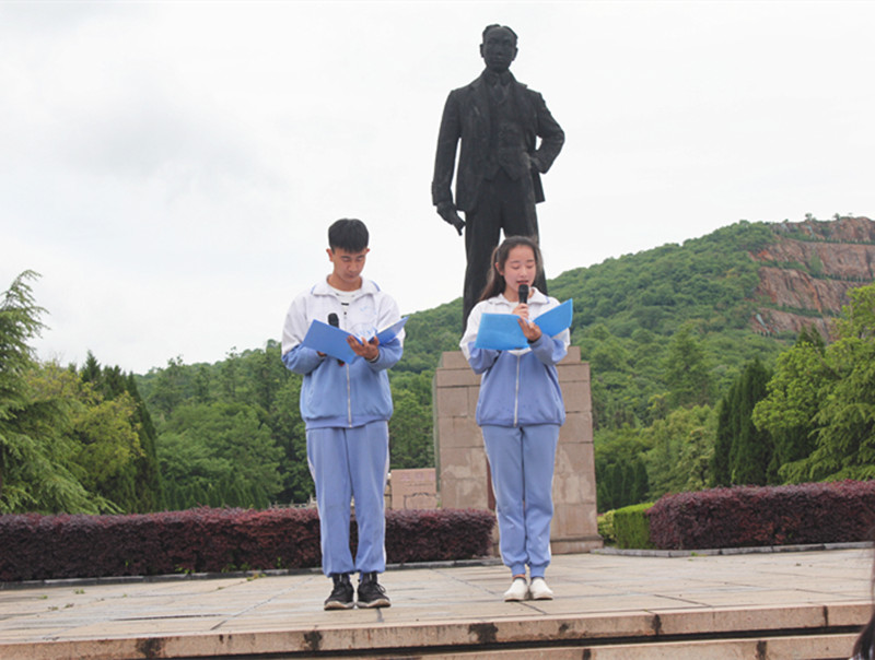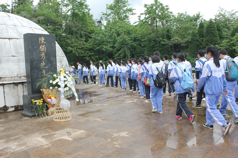 苍松翠柏,庄严肃穆。活动在雄壮的国歌声中拉开了序幕。首先,教师代表方江波老师发表讲话,方老师带我们回顾了陈独秀先生的一生及五四运动的光荣历史,勉励大家缅怀先烈,铭记历史,把握今天,开拓创新,创造一个美好的未来,让青春无悔!学生代表孙馨怡同学代表全体同学发言,并带领全体同学做了“继承优秀传统,努力报效祖国”的集体宣誓。接着,谷校长向陈独秀像深深鞠躬,发表了题为《弘扬五四精神 勇担时代重任》的演讲,要求全体同学努力做到明志、勤学、知礼、自强,勉励同学们应当秉承民族精神,传承五四精神,肩负青年使命,用知识加汗水,以满腔热情,去开拓、去创造、去拥抱新希望,共同开创美好未来!最后,校领导带领全体师生向陈独秀先生墓冢敬献了花篮。