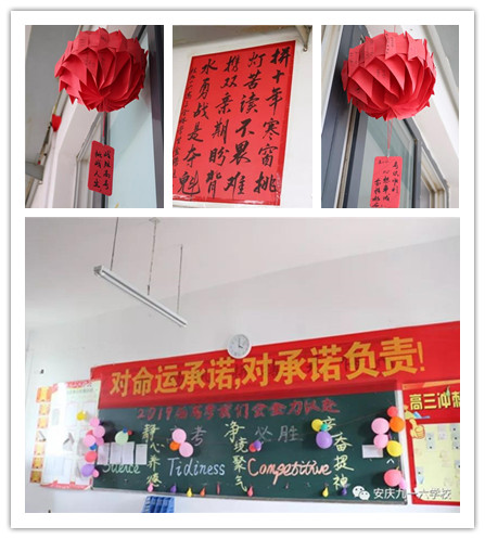 5月30日,高三的各班级教室门前大红灯笼高高挂,每个灯笼上都系着同学们的心愿卡,每一张心愿卡都书写着青春的无畏、拼搏、希望,每一句话语都传递着青春的力量。布置班级时,师生同心协力,构成了一幅幅温馨感人的画面,高考紧张压抑的气氛荡然无存,大家表情中透露着满满的喜气和十足的信心。