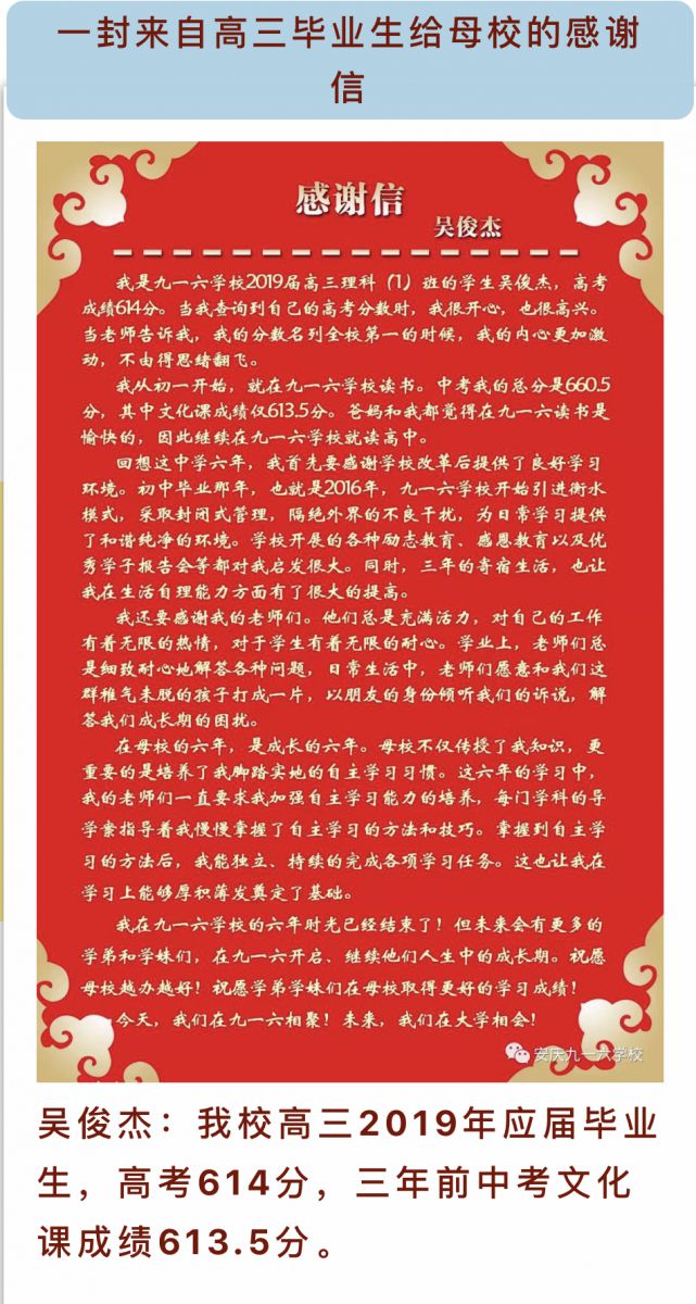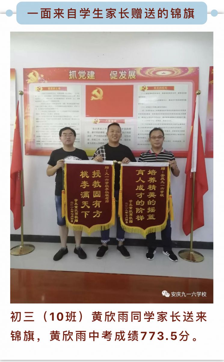 这注定是个丰收的季节,高考、中考陆续放榜,我校硕果累累。成绩的背后凝聚着全体九一六人的辛勤耕耘和默默付出。 来自学生发自肺腑的感谢信、家长赠与的锦旗及社会各界的高度评价,不仅是对学校工作的肯定和鼓励,更是一种鞭策与激励。 关心每一位学生的健康全面成长是我校的师德理念,关心学生关注成长,对学生负责是我校每一位教师的责任。在学校,爱岗敬业,爱生如子的老师还有很多,全校教职工都在各自的工作岗位上默默奉献,力争做到让学生喜欢,让家长满意,让领导放心,让社会认可! 真情的感谢、鲜红的锦旗彰显着九一六学校教育教学成果深入人心。真爱如雨,润物无声,学校将一如既往地把学生发展放在首位,争取让每一位学生都能做最好的自己,绽放最美的精彩。