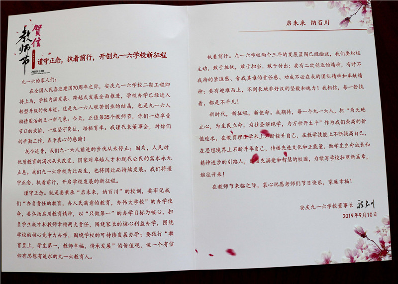 上午课间时间,校长何仲华、副校长张永国、程启胜、王平等校领导带着董事长程启川为大家精心准备的慰问信和节日祝福,来到各年级教师办公室,向辛勤耕耘在教育战线的老师致以节日的祝贺和诚挚的问候。