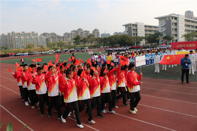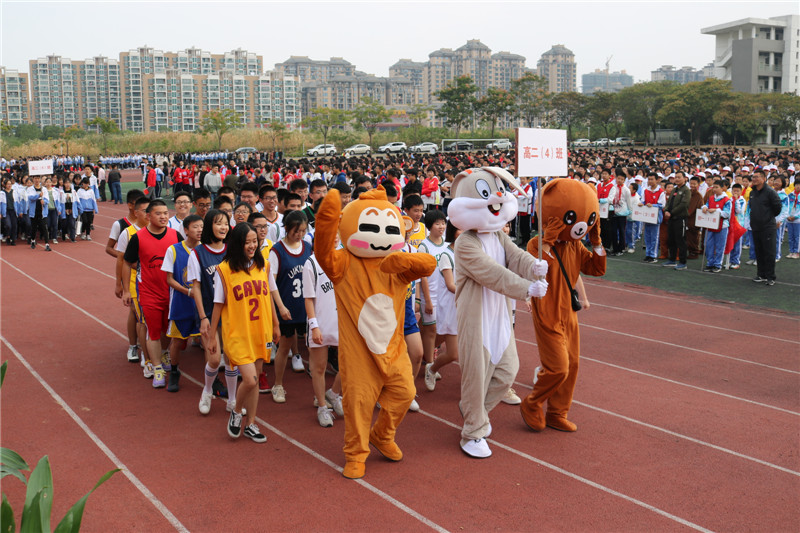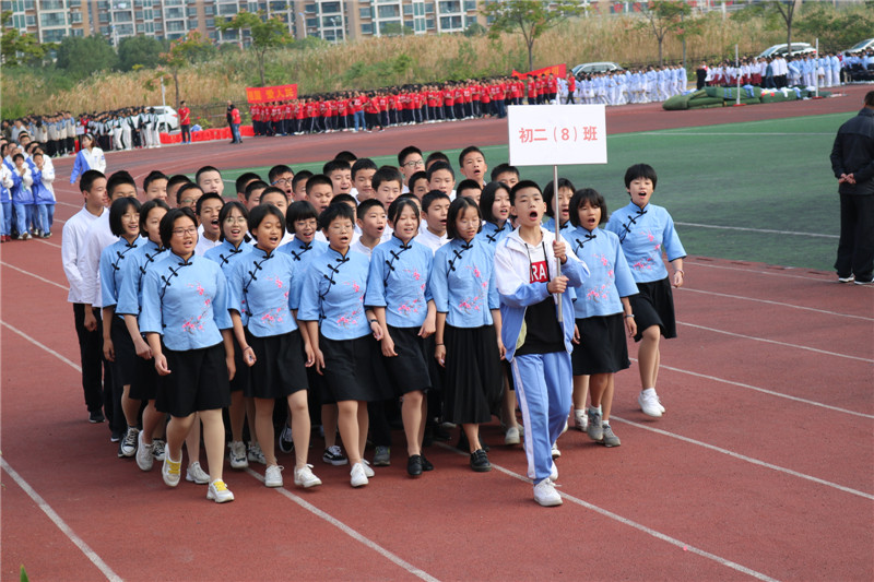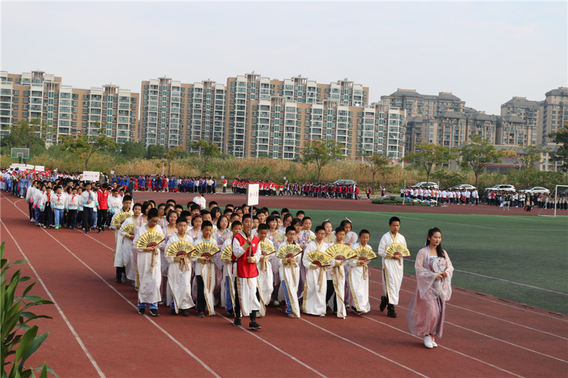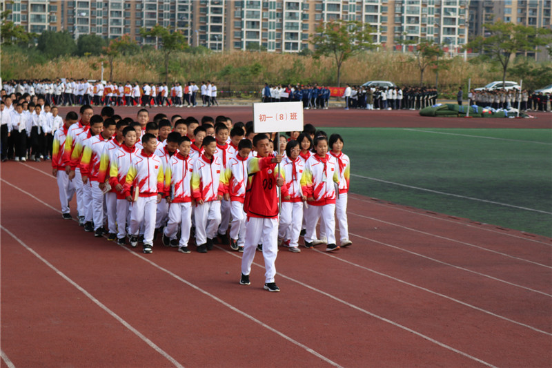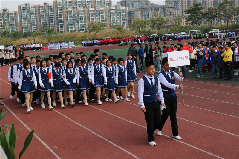 伴随着悦动的《运动员进行曲》,入场式开始。走在队伍最前面的是开幕式仪仗队,他们由国旗方阵、校旗方阵、会徽方阵、口号方阵、班旗方阵等组成。一个个方阵队列整齐,英姿飒爽;同学们昂首阔步,精神饱满,展示出青年特有的朝气与活力。