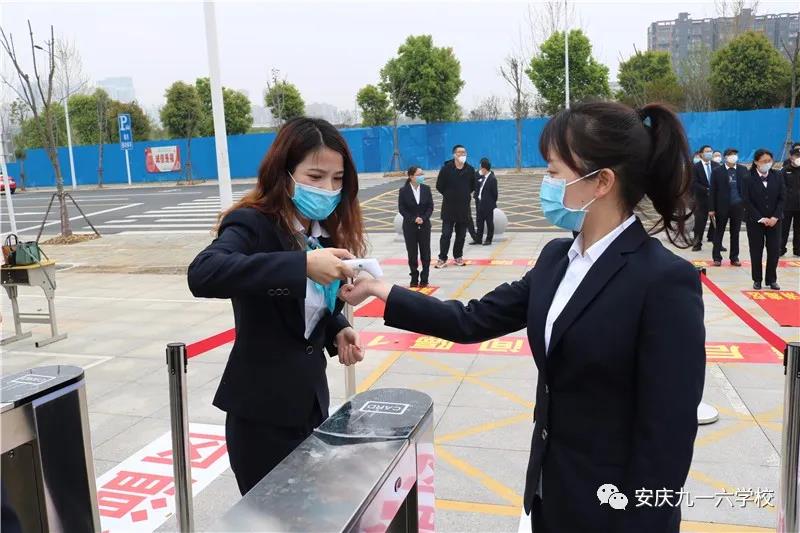 学生们(由教师扮演)戴好口罩,在校门口按照班级有序排好队伍(前后左右间隔1米),经过地毯消毒区对脚底进行消毒后,进入测温登记区。各班班主任和协防员对学生进行体温检查,并审查学生的“一表一书一证明”。