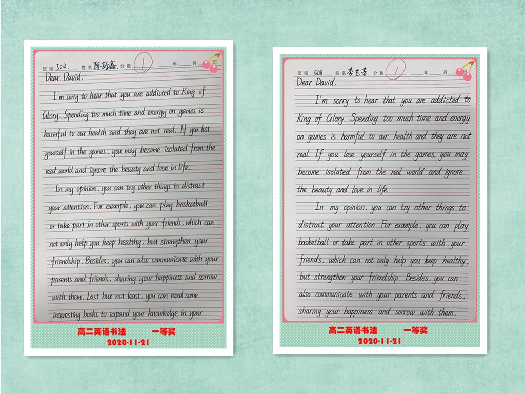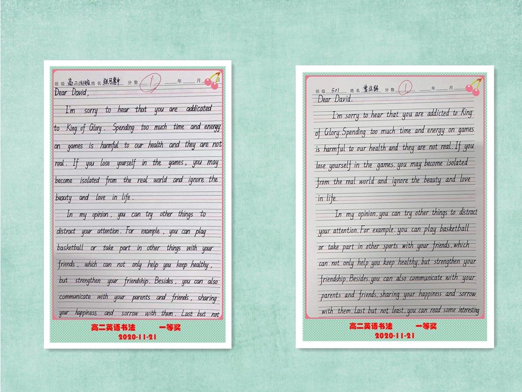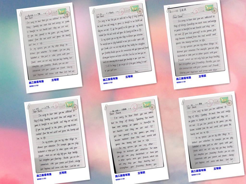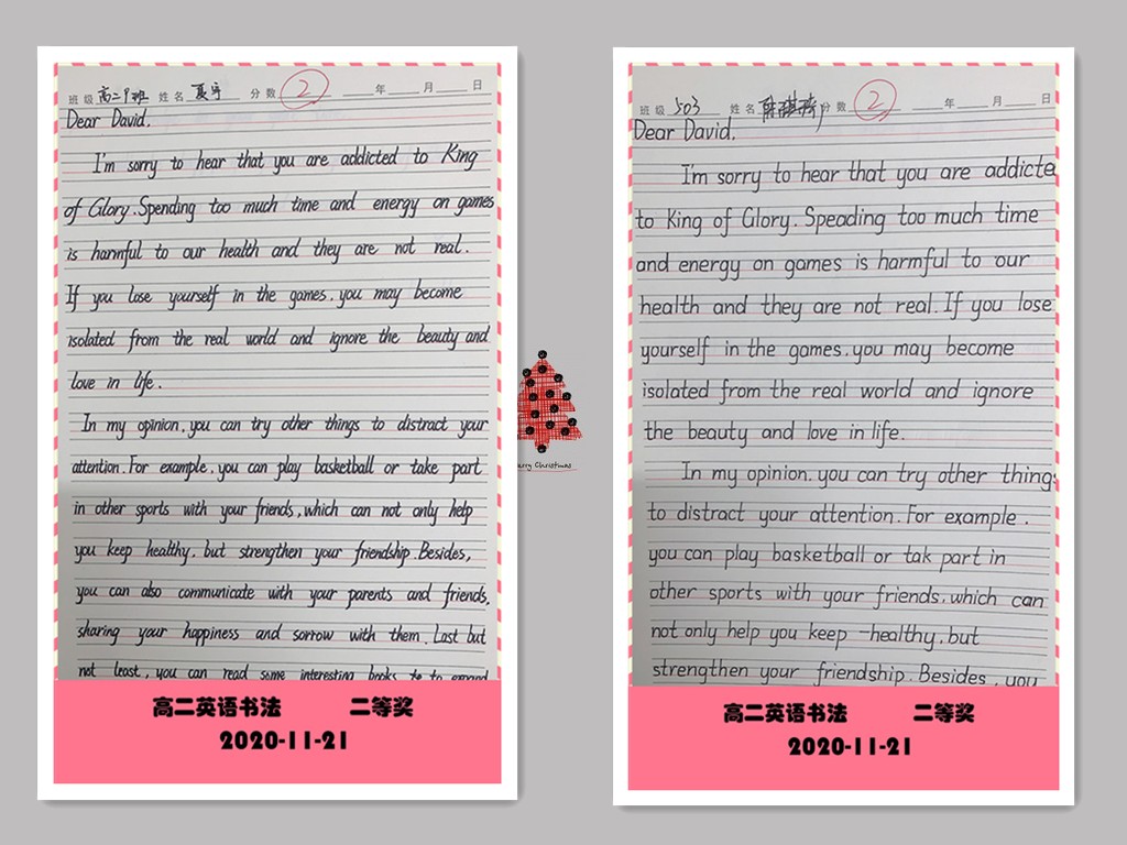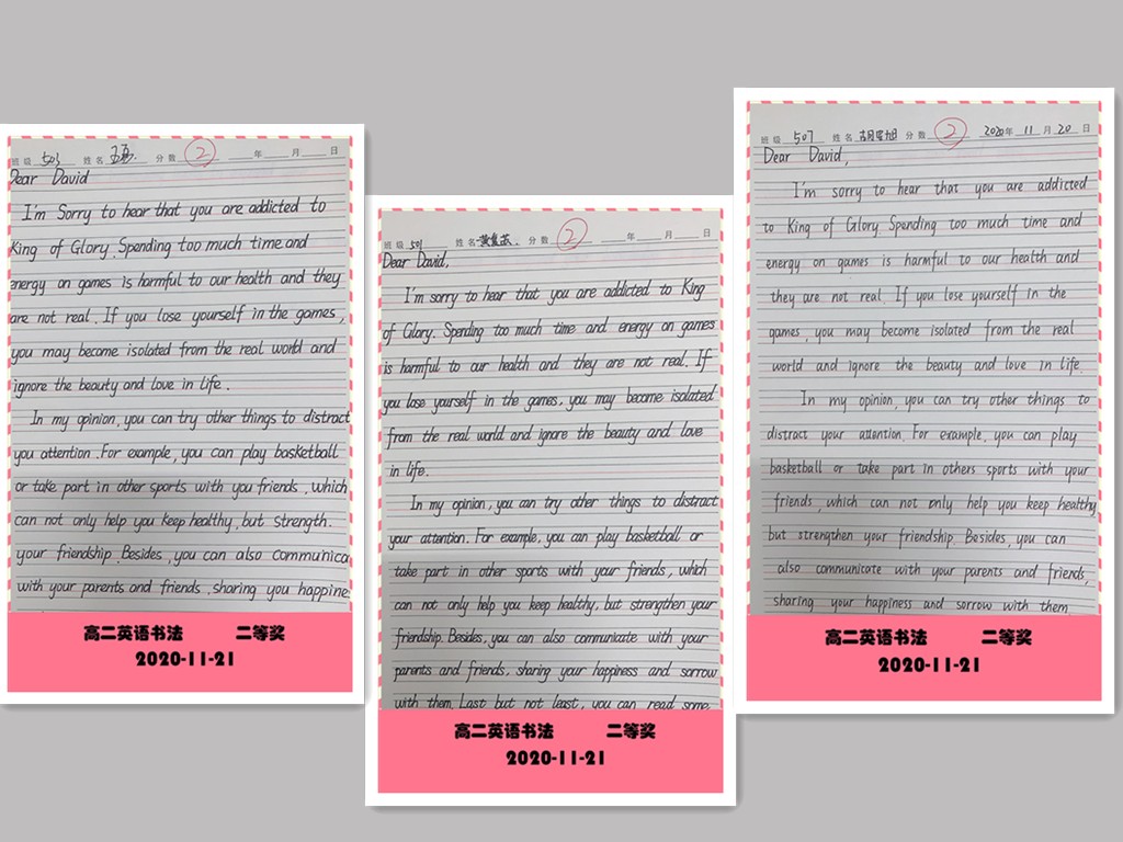 古人云:“字如其人”。良好的书写习惯不仅反映了学生端正的学习态度,更是其良好学习习惯的重要组成部分。为提高学生的英语书写质量,我校高二年级组织了英语书写比赛。