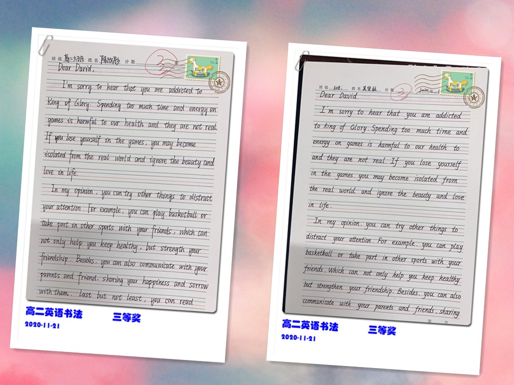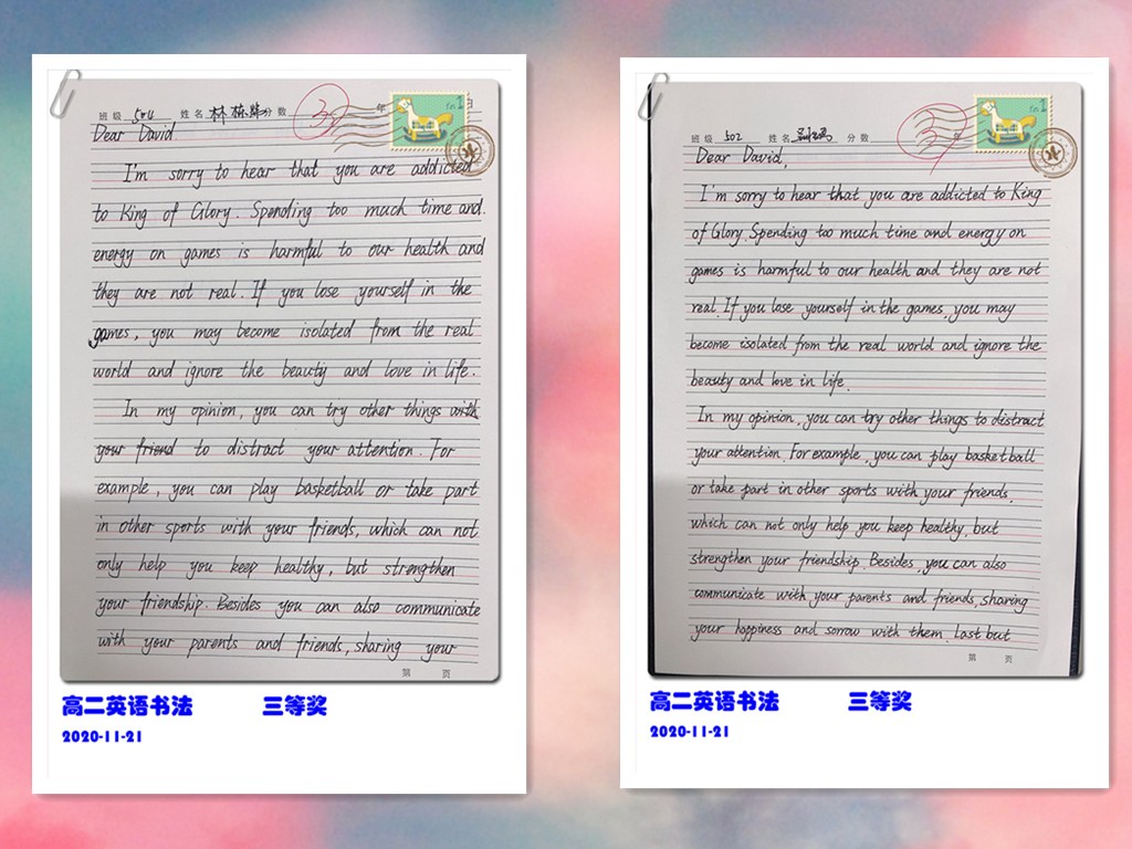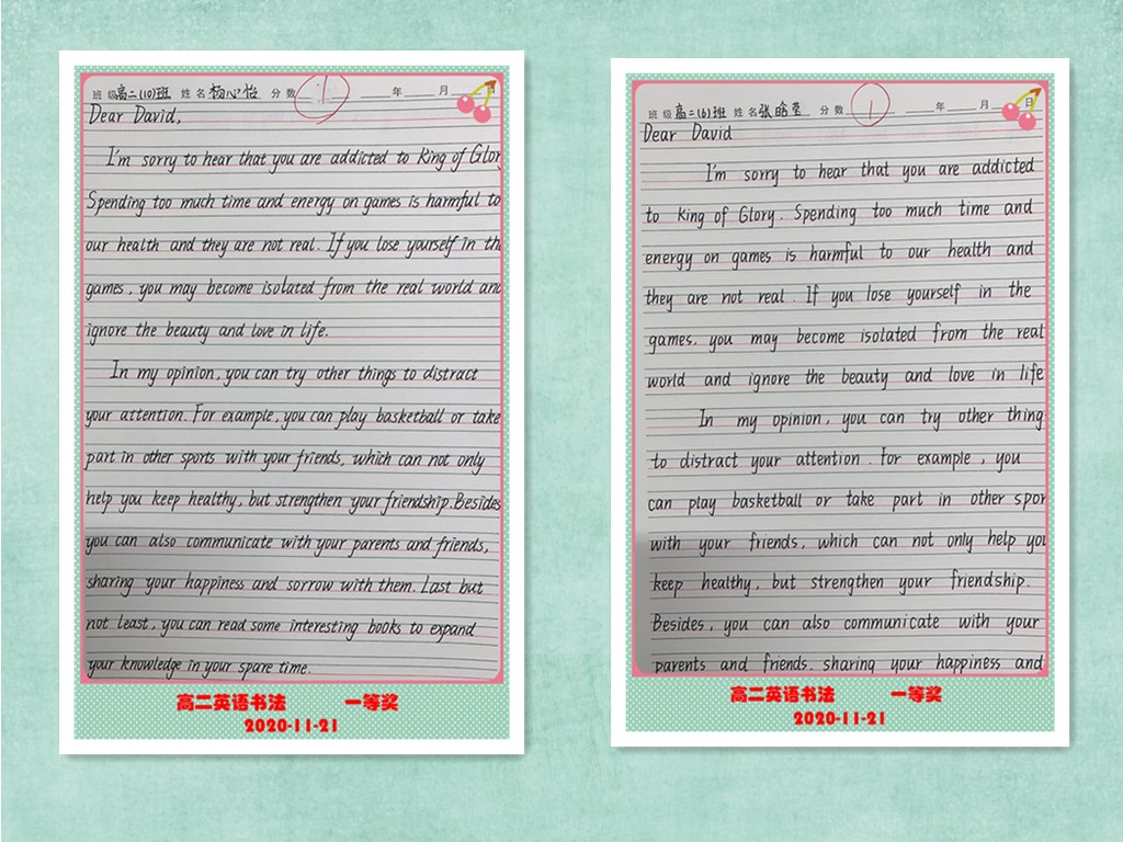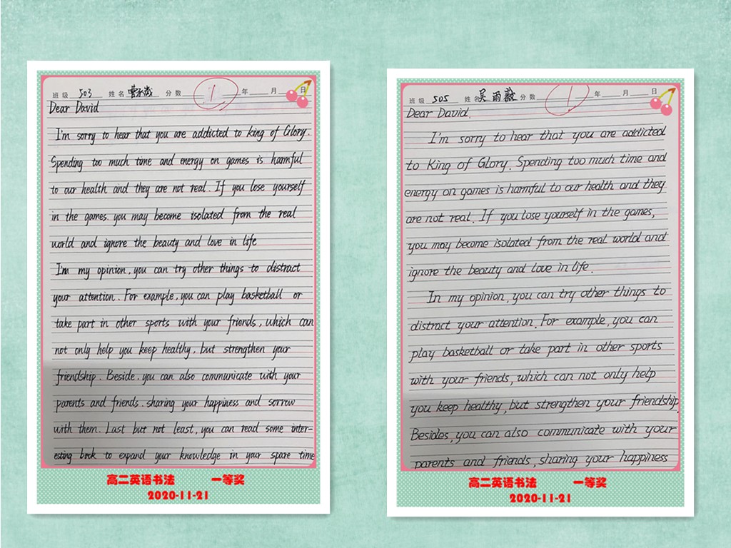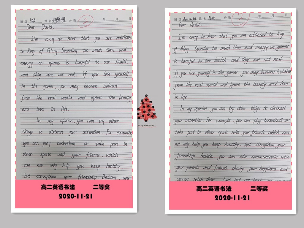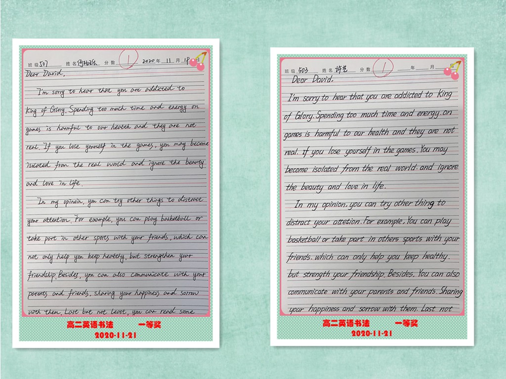 古人云:“字如其人”。良好的书写习惯不仅反映了学生端正的学习态度,更是其良好学习习惯的重要组成部分。为提高学生的英语书写质量,我校高二年级组织了英语书写比赛。