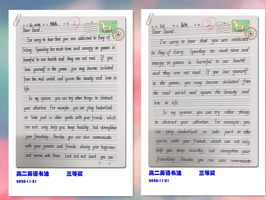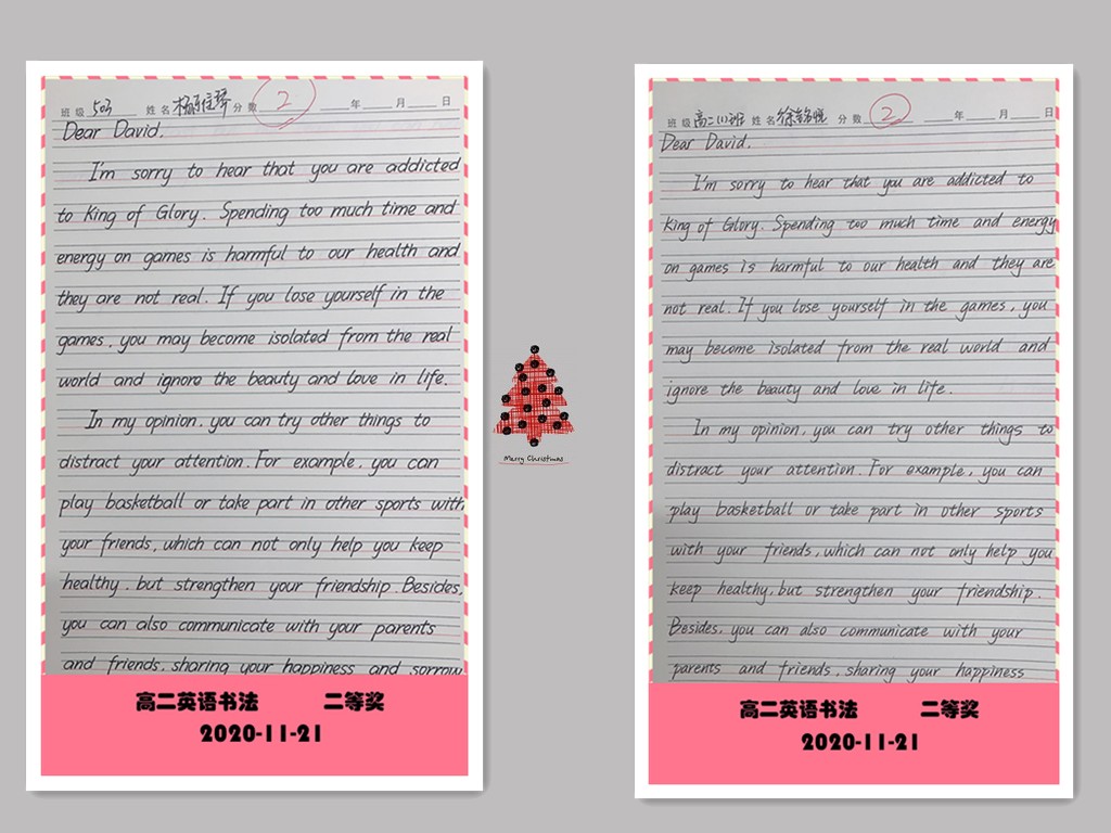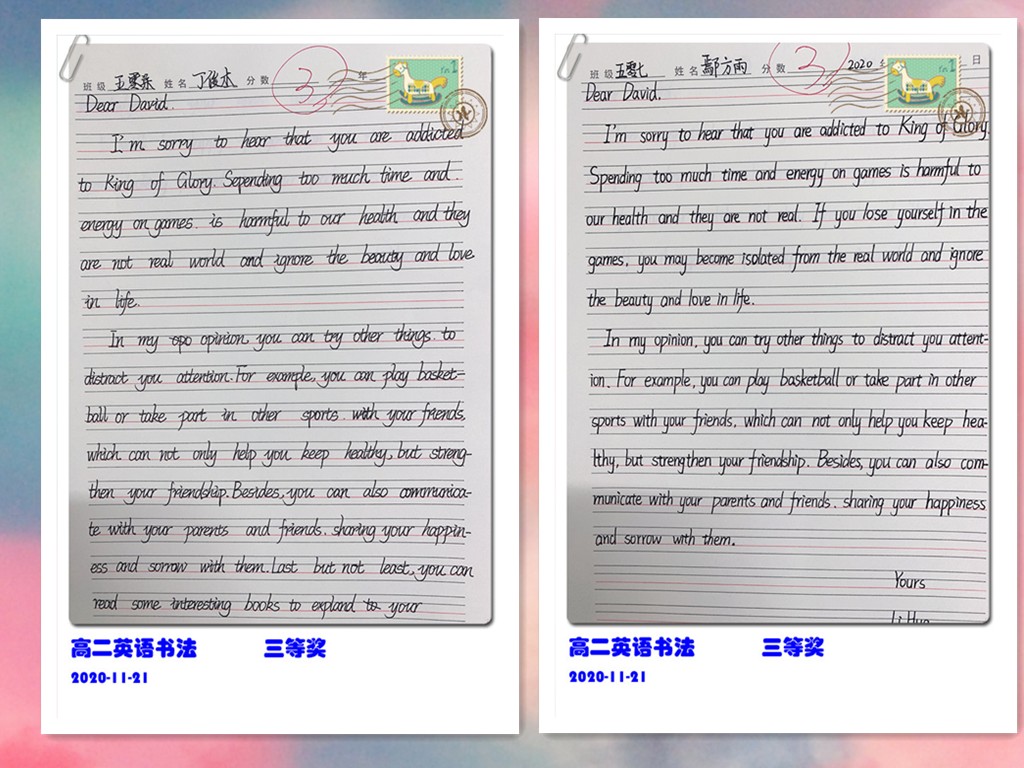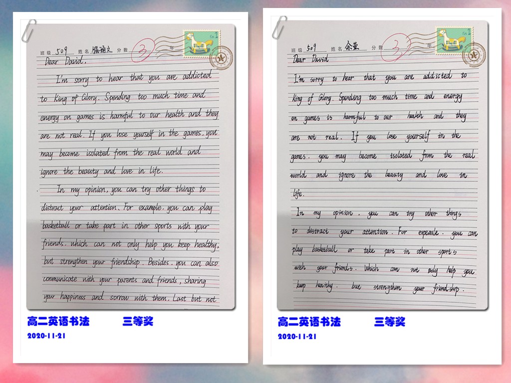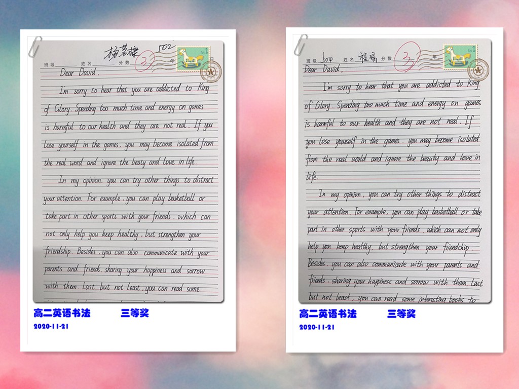 古人云:“字如其人”。良好的书写习惯不仅反映了学生端正的学习态度,更是其良好学习习惯的重要组成部分。为提高学生的英语书写质量,我校高二年级组织了英语书写比赛。