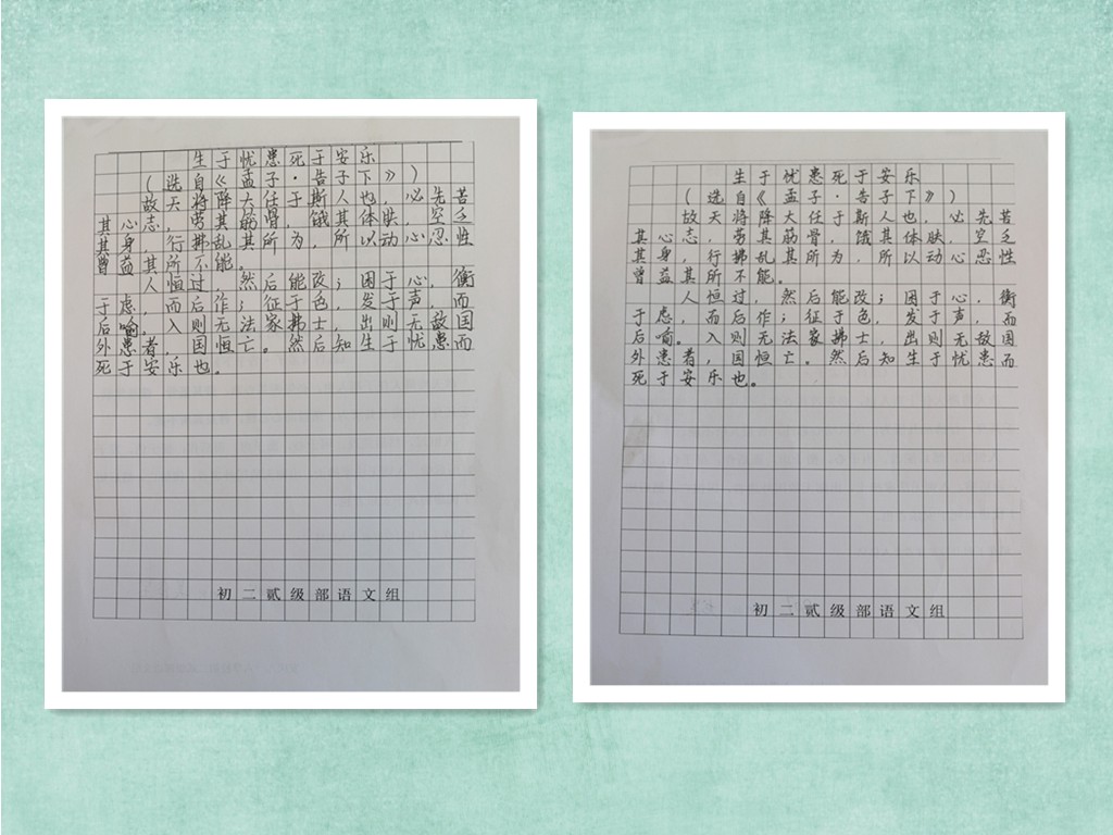 为进一步强化学生的汉字、英语书写能力,提高学生的书写水平,培养学生正确的书写习惯;同时引导学生把汉字、英文写得正确、端正、整洁、美观,从整体上提高学生的书写质量,让学生练就一手中英文好字,受益终生。本周,我校初中二年级组织学生开展中英文硬笔书写大赛。