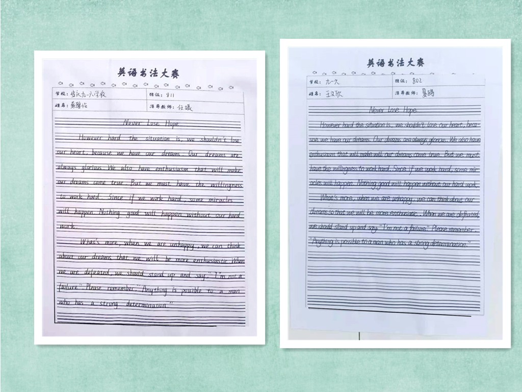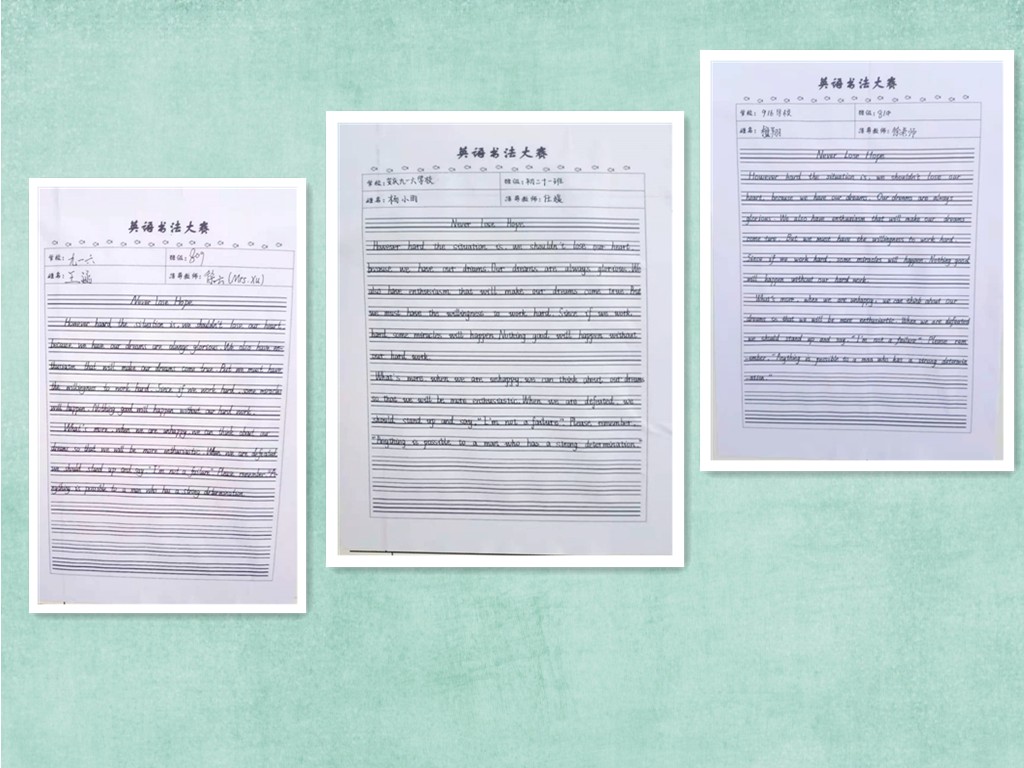英语书写比赛,旨在规范学生英文书写,展现英语书写艺术之美,在听、说、读的基础上,全面提高写的技能。
