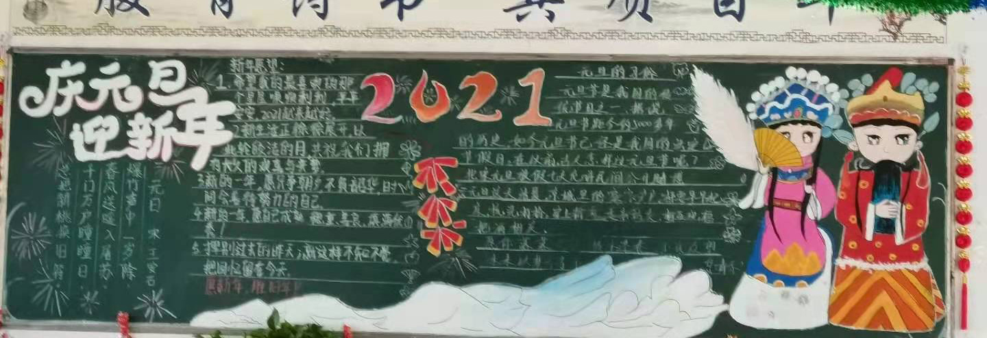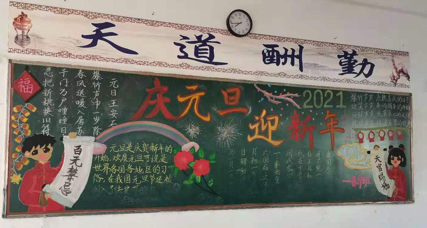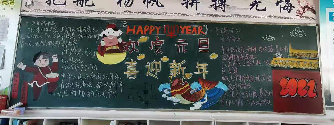 此次“庆元旦·迎新年”黑板报充分展示了同学们的才华和创造力,将课堂知识和课余文化巧妙地融合,营造了健康、活泼、生动的校园文化艺术氛围,同时也是送给2021年元旦的一份贺礼。