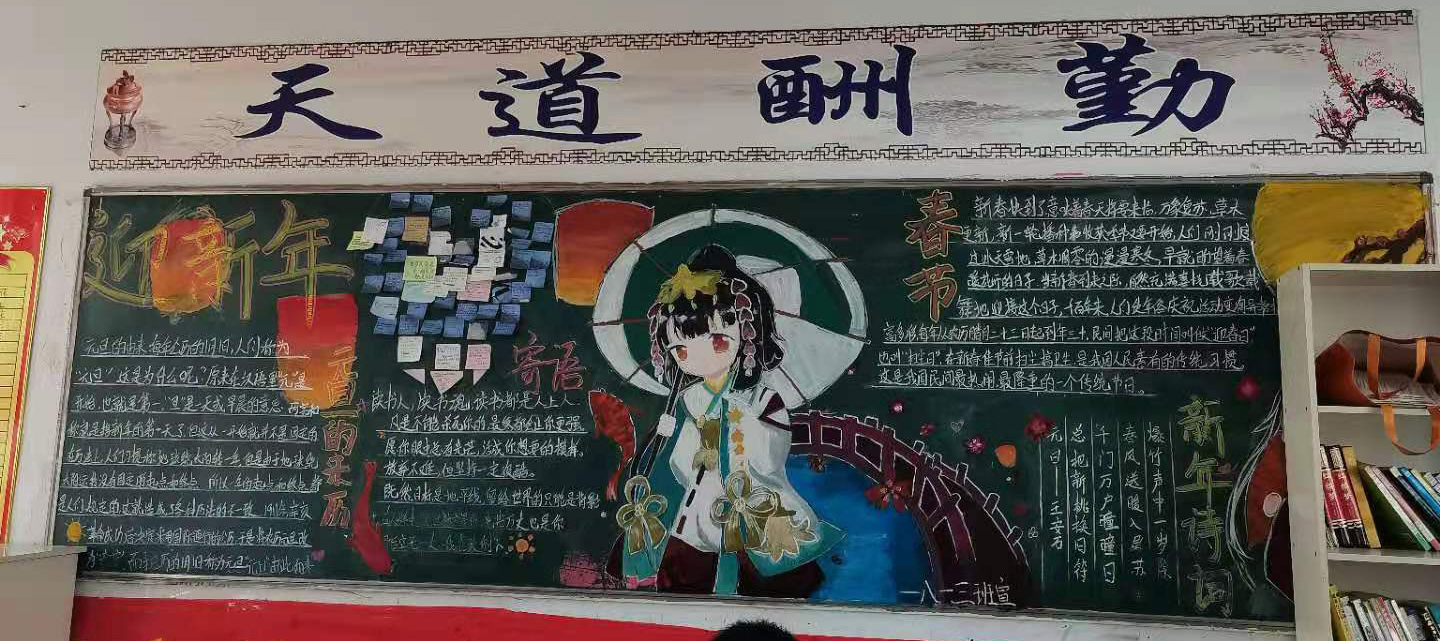 各班黑板报围绕主题,同学们精选出的新年愿望和关于元旦的来历等素材,精心设计版面,纷纷通过优美的画面,精美的文字表达了学子们对新年的祝福和浓浓的深情。为我校校园文化、班级文化增添了一道靓丽的风景线。