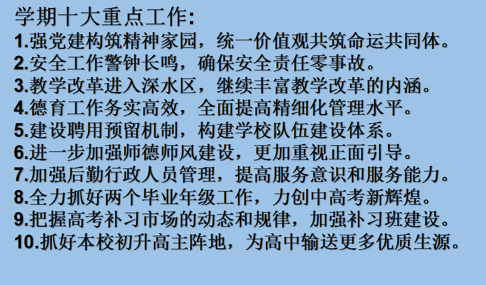 目标是奋勇追逐的梦想,方向是学校发展的力量。本次会议已将2021年春季新学期的序幕全面拉开,学校全体教职员工进一步明确了工作任务与要求,提高了认识,凝聚了力量,为新学期学校教学改革走向内涵发展做好了准备,为新学期各项工作的顺利开展奠定基础。