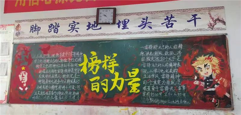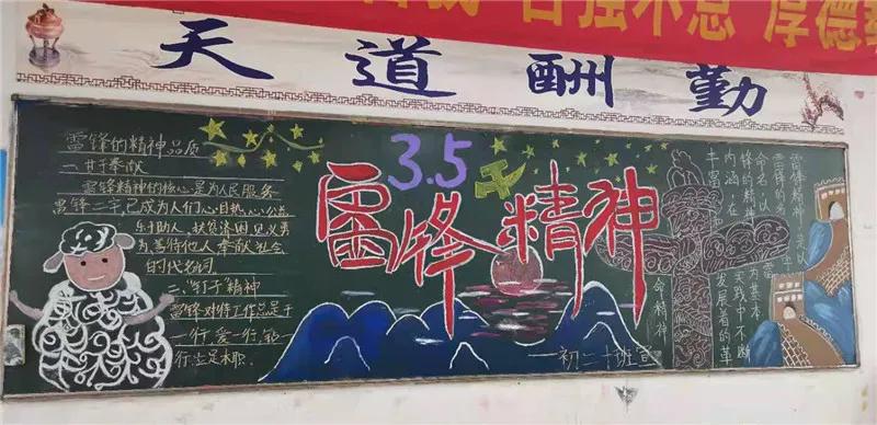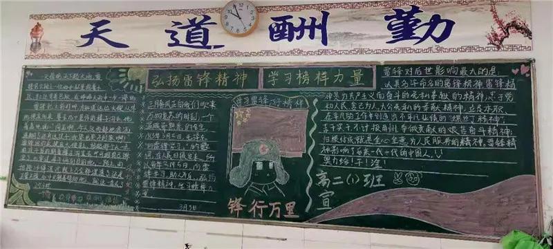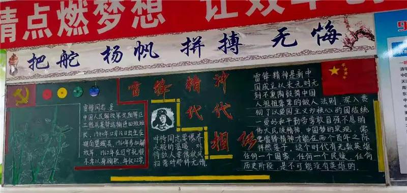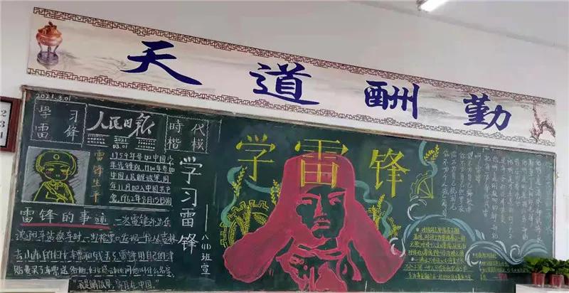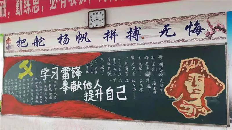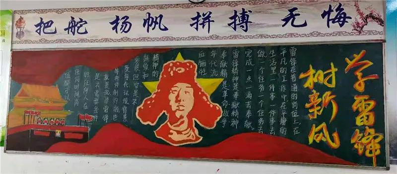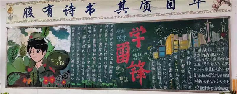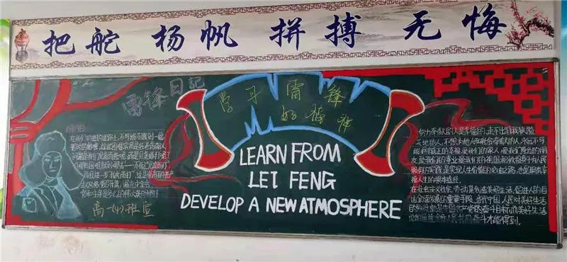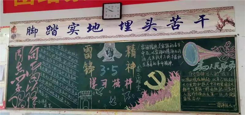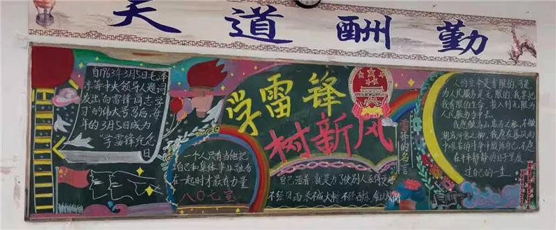 在班主任的精心组织下,同学们开动脑筋,选编内容,设计版头、文字排版、绘制插图……黑板报主题鲜明,介绍雷锋生平、宣传雷锋感人事迹、收录雷锋名言、再现雷锋日记、宣传班级中的好人好事,其形式多样,内容丰富。