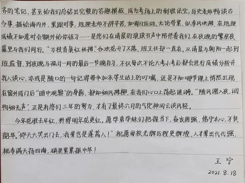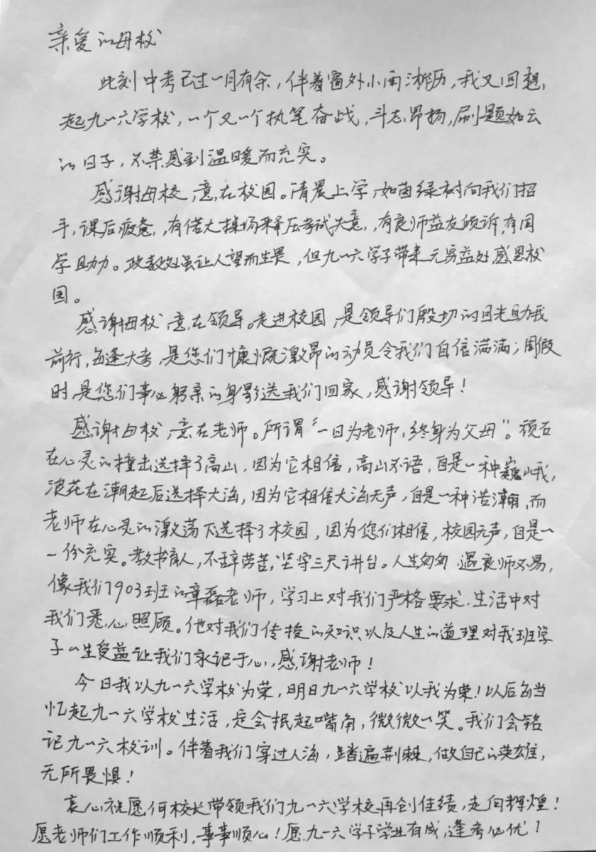 王宁家长向董事长和学校表示衷心的感谢:感谢九一六学校对王宁六年的培养,优异成绩的取得离不开学校严格精细的管理和老师认真辛勤的付出。