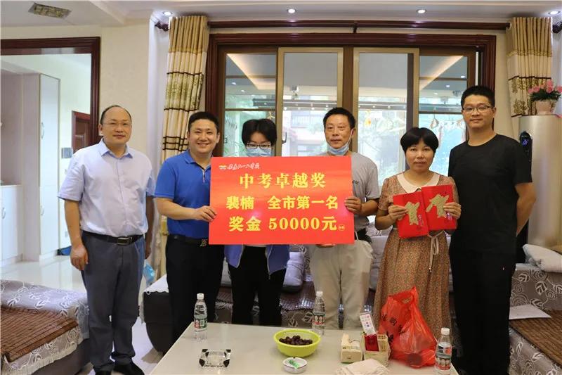 在市中考第一名裴楠家中,程董事长和何校长向裴楠送上奖助学金5万元,向她表示祝贺。程董事长殷切期望裴楠同学在今后的学习道路上,继续发扬九一六的优良传统,保持良好的学习生活习惯,勤奋学习,努力拼搏,奋发向上,努力使自己变得更加优秀。裴楠家人的喜悦之情,溢于言表,他们表示:九一六学校科学的管理,为孩子提供了一个和谐的学习生活环境,让裴楠取得喜人的成绩。