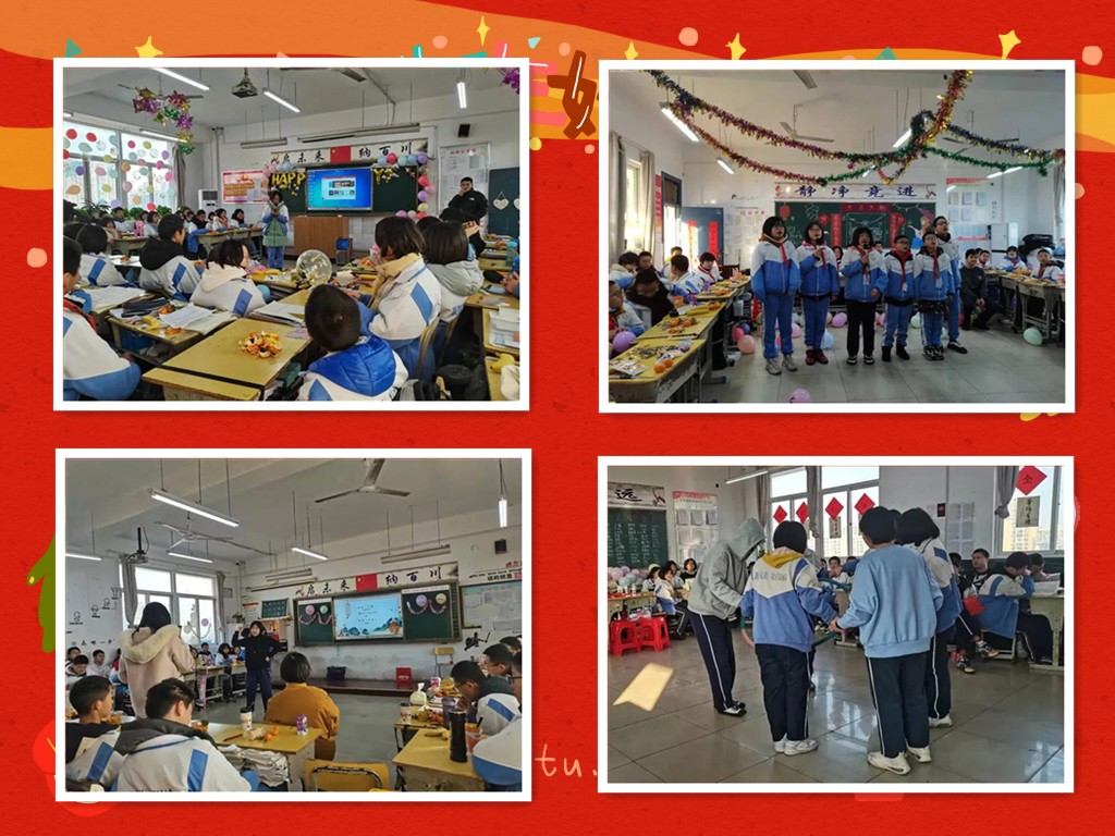 高歌曼舞辞旧岁,欢声笑语迎新年。12月30日上午,我校以班级为单位开展了庆元旦联欢活动,迎接2022年的到来。全校师生合力把各班教室布置得异彩纷呈,每一间教室都装饰的极具特色,有的班级门上贴上了喜庆的对联;有的班级窗户上贴了手工制作的窗花;有的班级挂上了灯笼……现场“年味”满满,处处洋溢着温馨、喜庆的气氛。